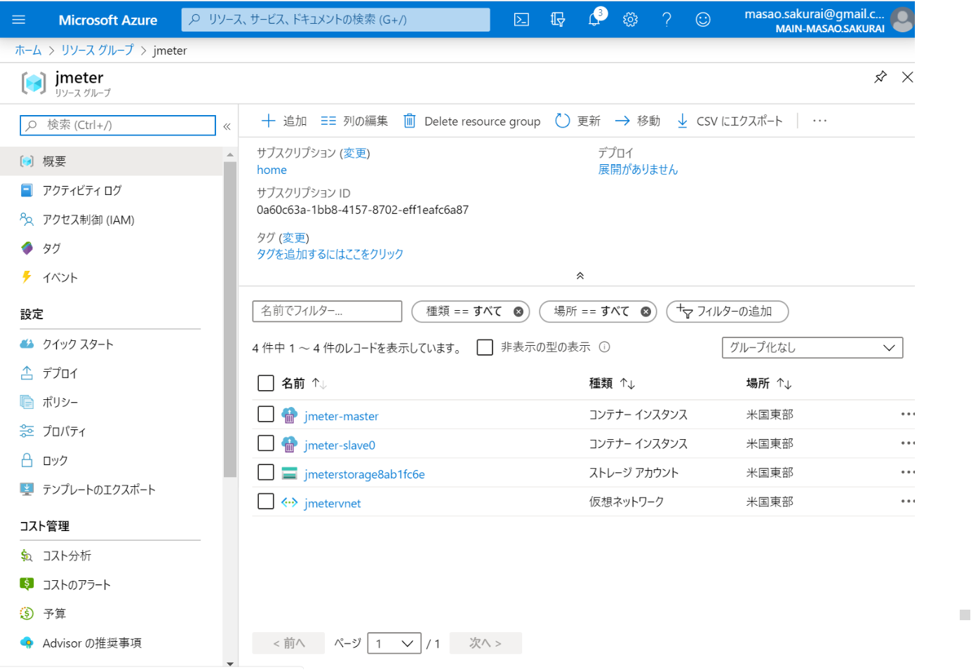 jmeterというリソースグループにコンテナインスタンスが自動的に作成されて処理が実行されている。処理が完了すると以下のリソースは自動的にすべて削除されます。