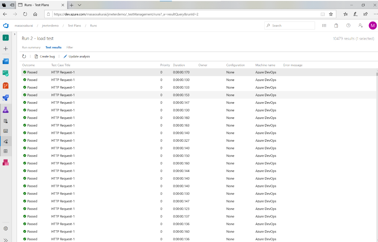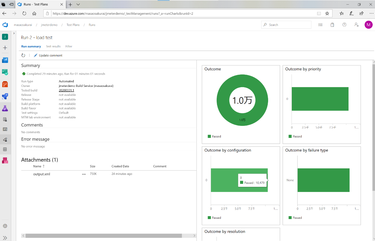 テストプランのrunsを見ると実際の実行した結果が表示されます。