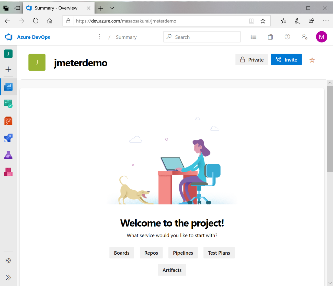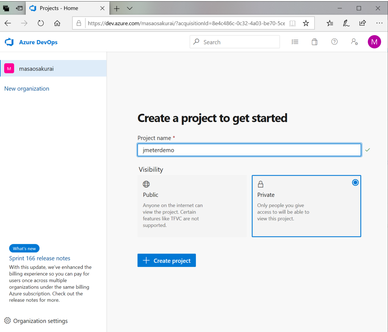 組織の作成完了(masaosakurai)とプロジェクト(jmeterdemo)の作成する