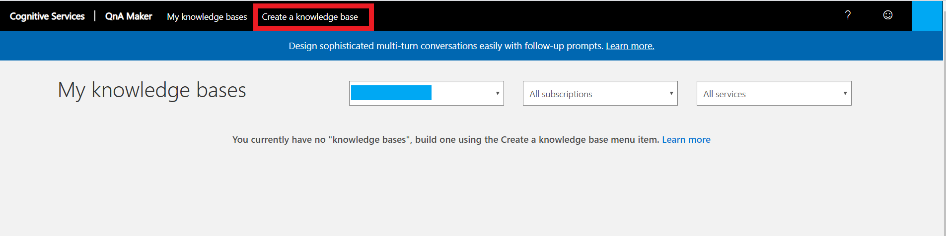 2. 左上の「Create a knowledge base」をクリックして、ナレッジベースの作成をしていきます。