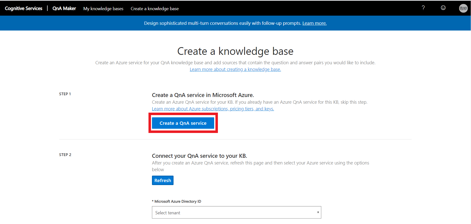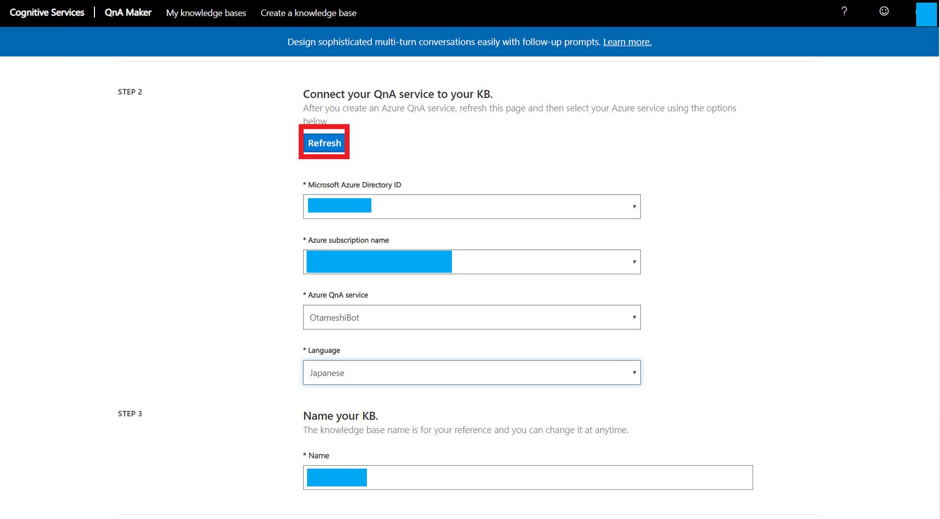 4. リソースが作成できたら、QnA Makerのポータルに戻り、STEP2の「Refresh」ボタンを押してリロードしてから項目をSTEP3まで入力していきます。