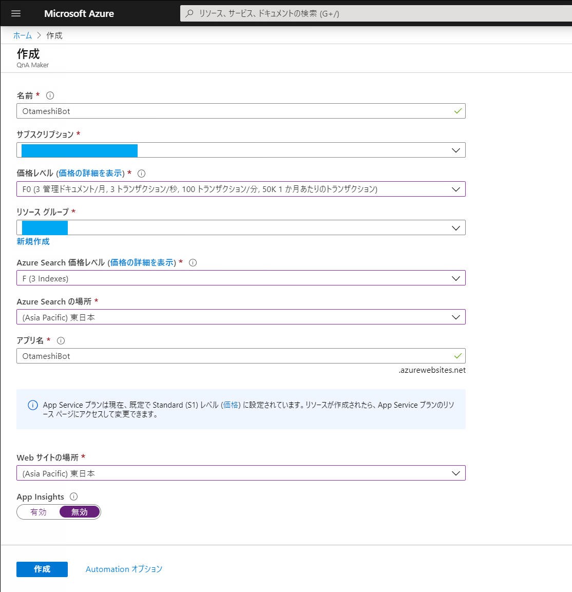 先ほどのページの「Create Bot」を選択して、Azure Portalに遷移したら、ボットの名前とサブスクリプション、リソースグループなどを以下のように入力していき、作成を押します。