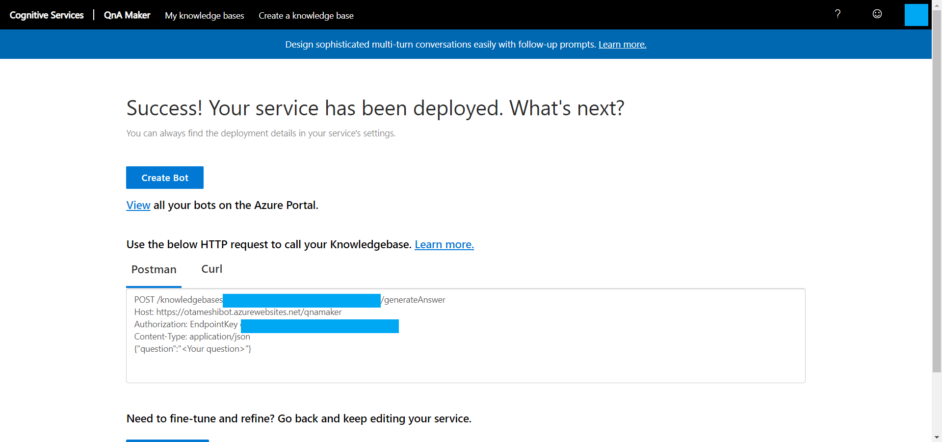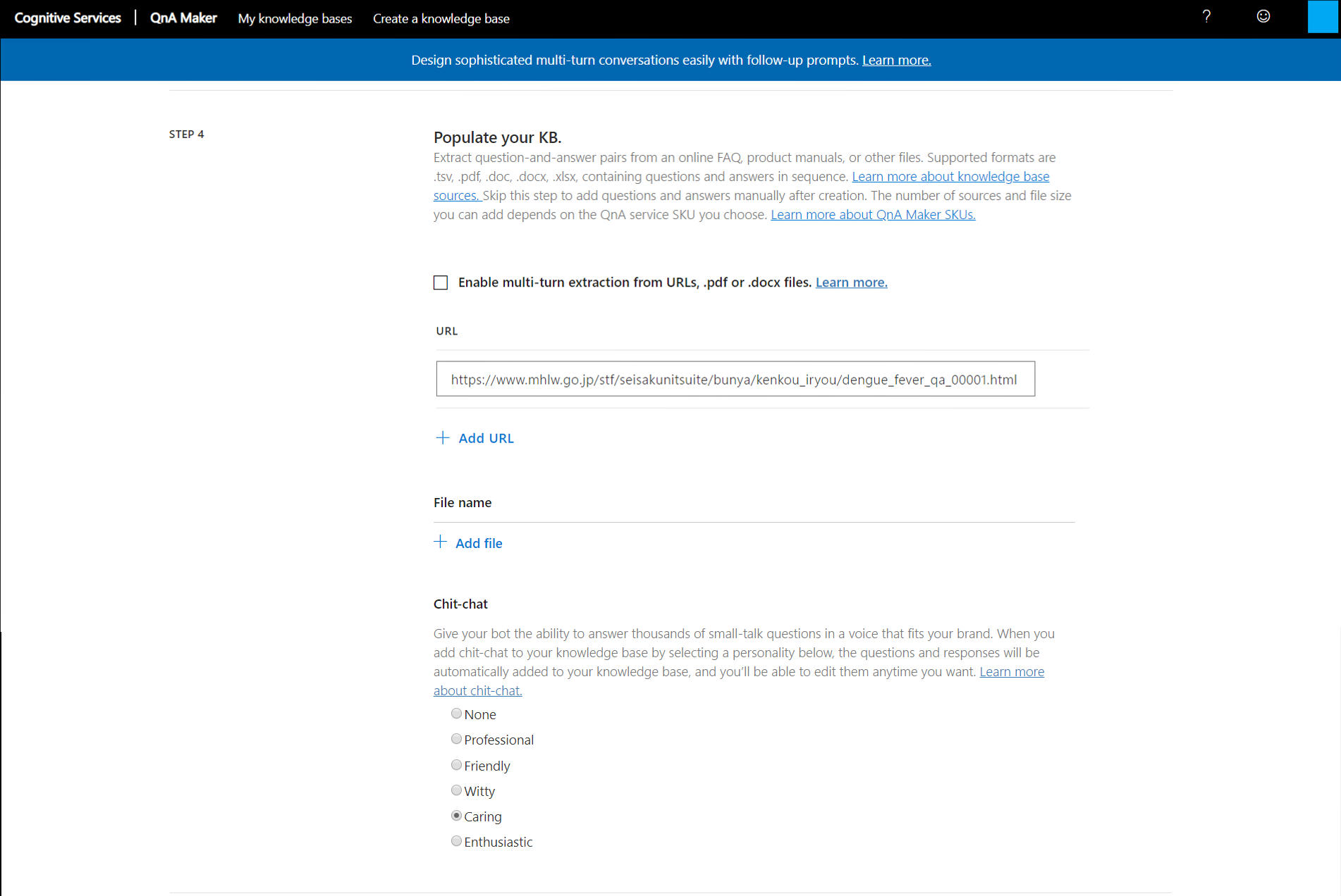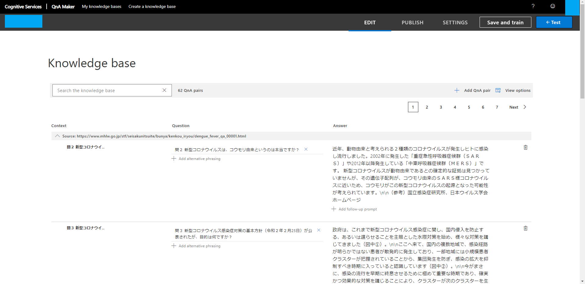 ここではボットに教える知識、つまり質問とその回答のペアをQnA Maker のナレッジベースに格納していきます。