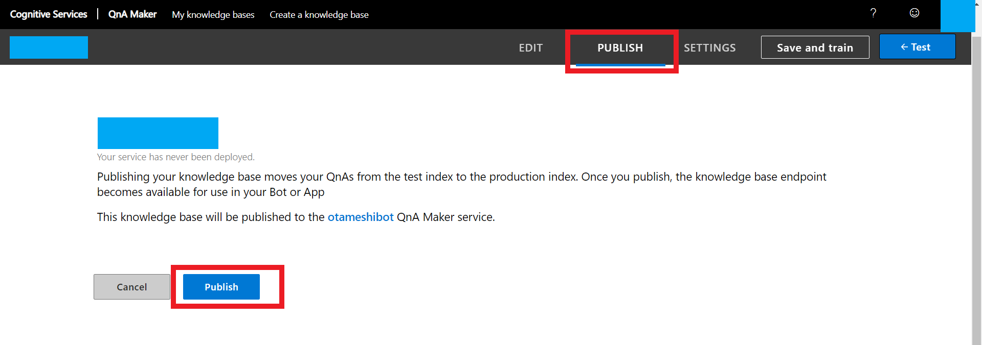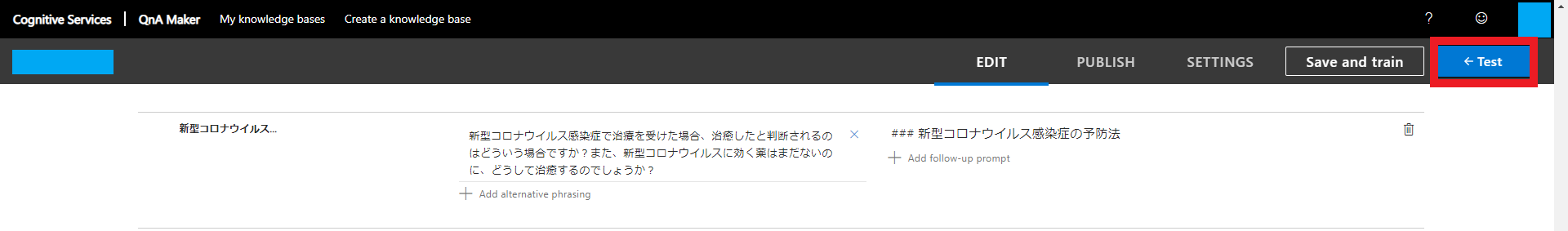 修正が終わったら、右上の「Save and train」を押して保存とQnA Makerの学習を行います。