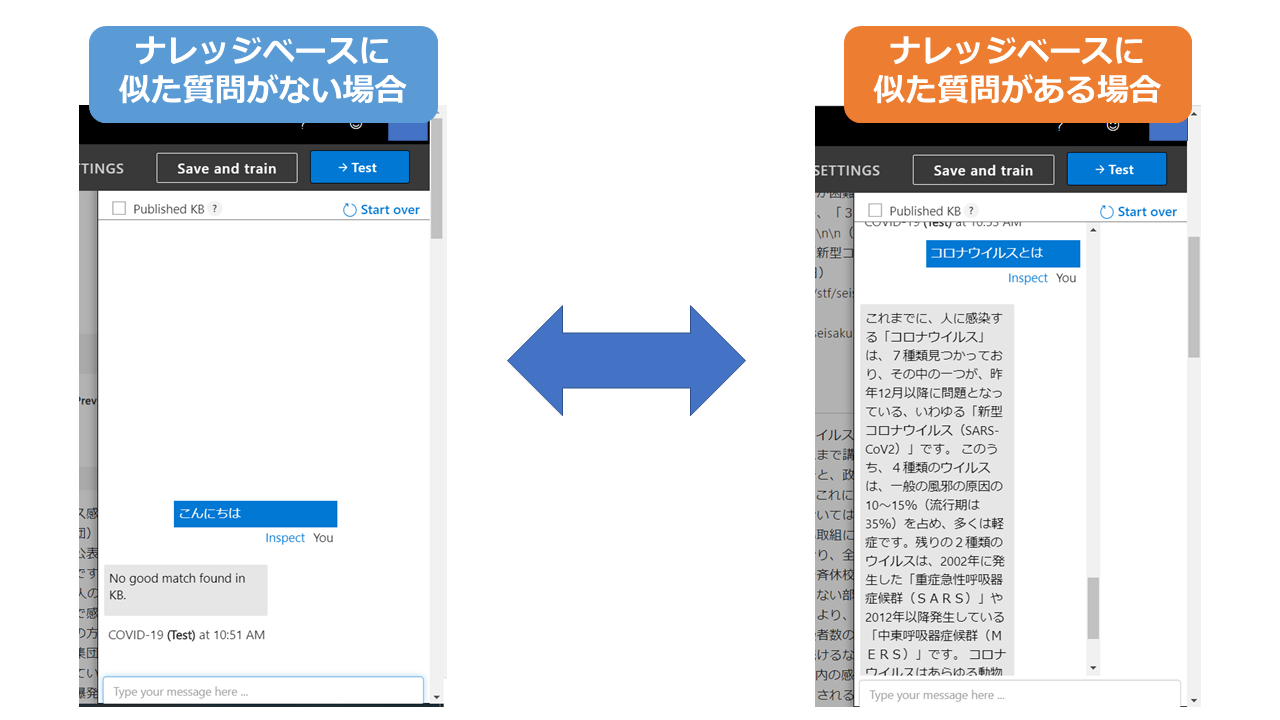 ナレッジベースに回答がない場合は左のようにマッチしませんでしたと返ってきますが、似た質問がある場合は右のように回答が表示されます。