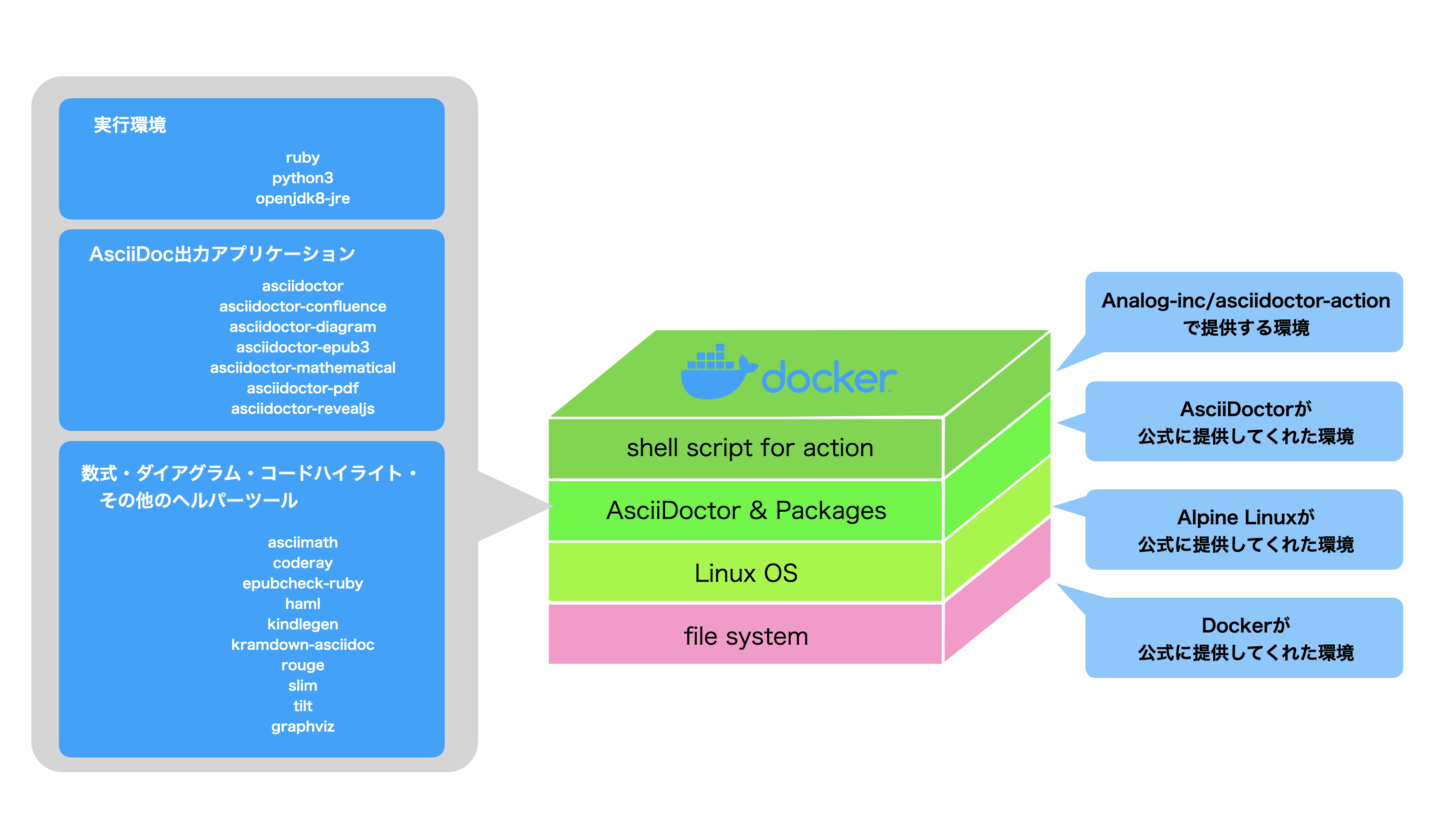 次回は少し難しい話になりますが、「Analog-inc/Asciidoctor-action」で利用したDockerコンテナの技術について少し説明したいと思います。