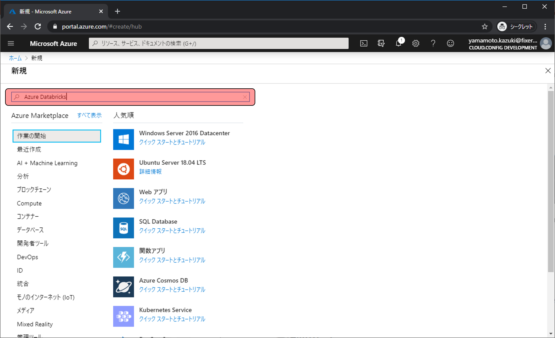 まずはAzure Databricksを作成します。下記URLからAzure Portalへ移動し、リソースの作成をクリックします。