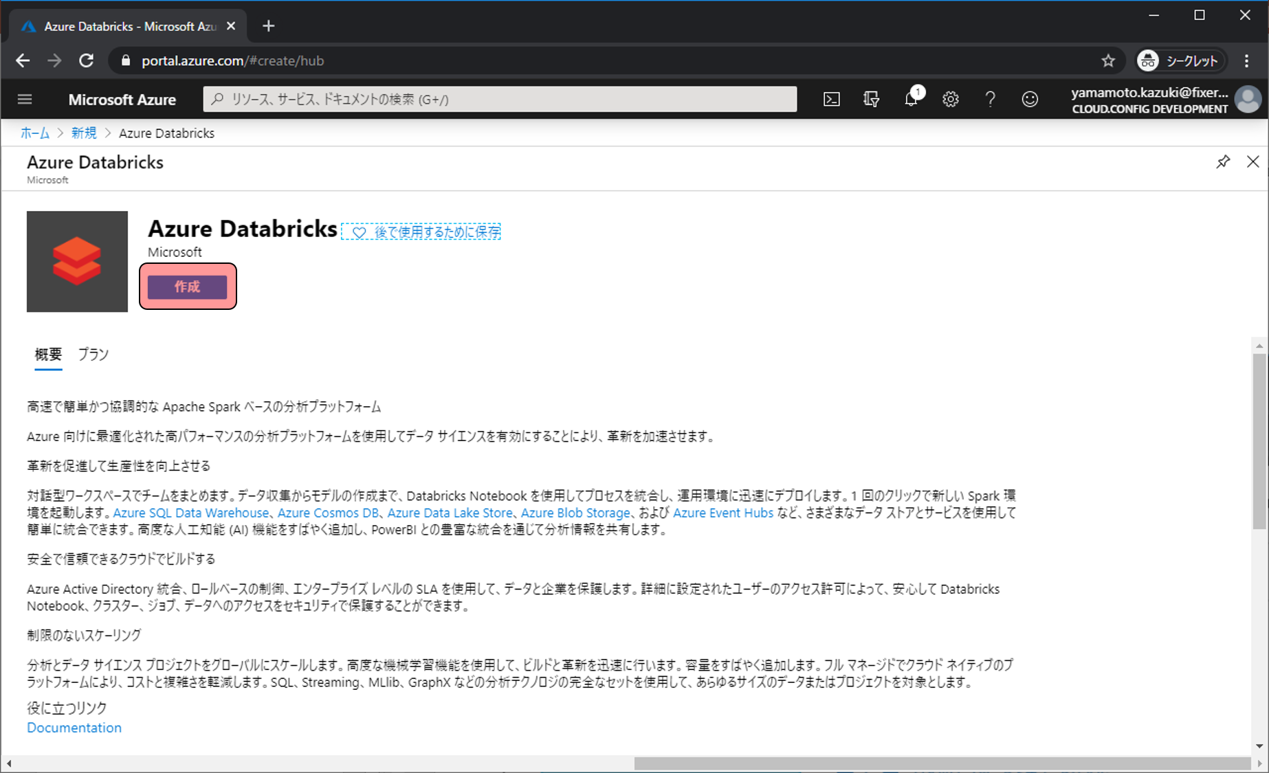 Azure Databricksの概要等が表示されます。作成をクリックします。
