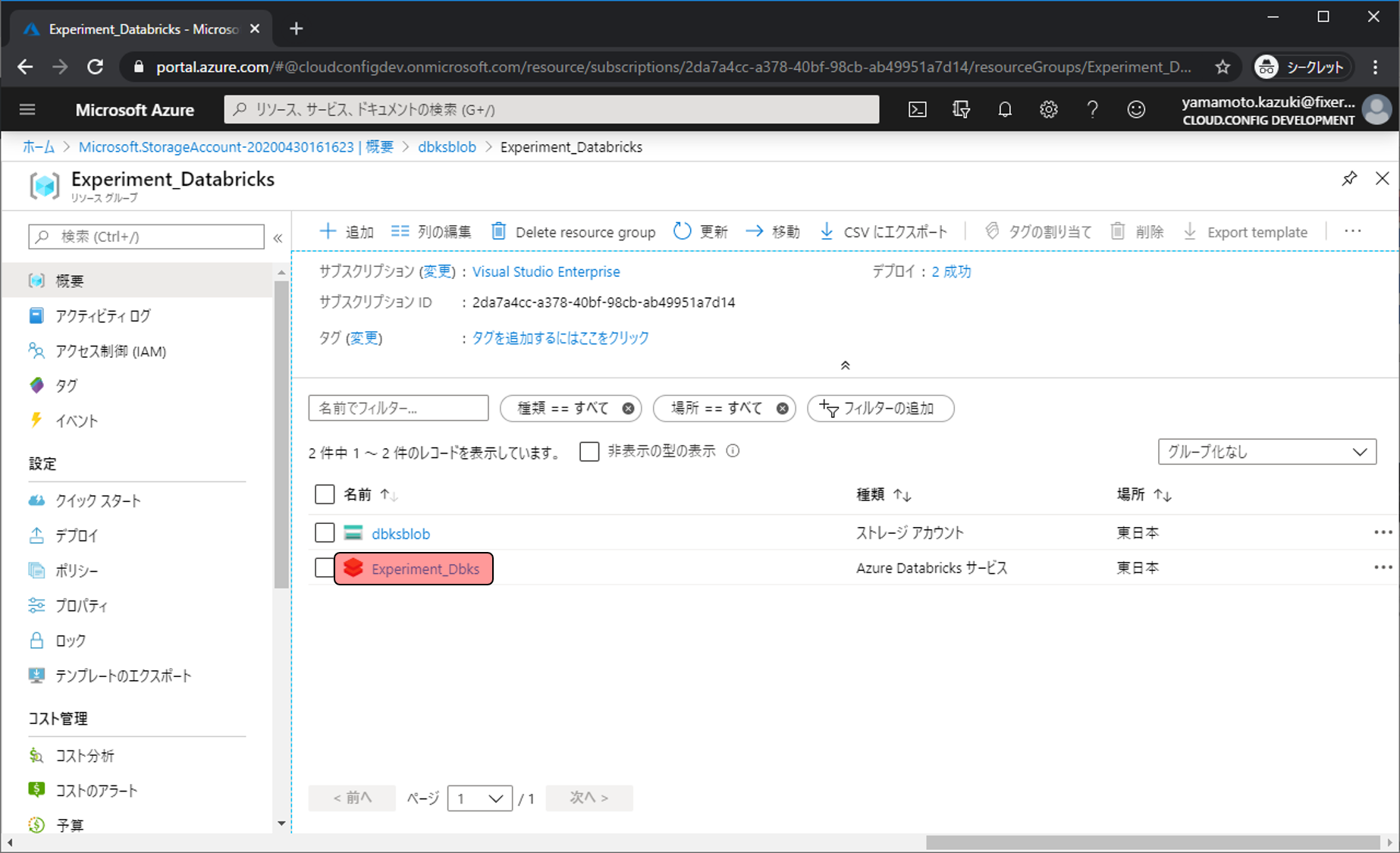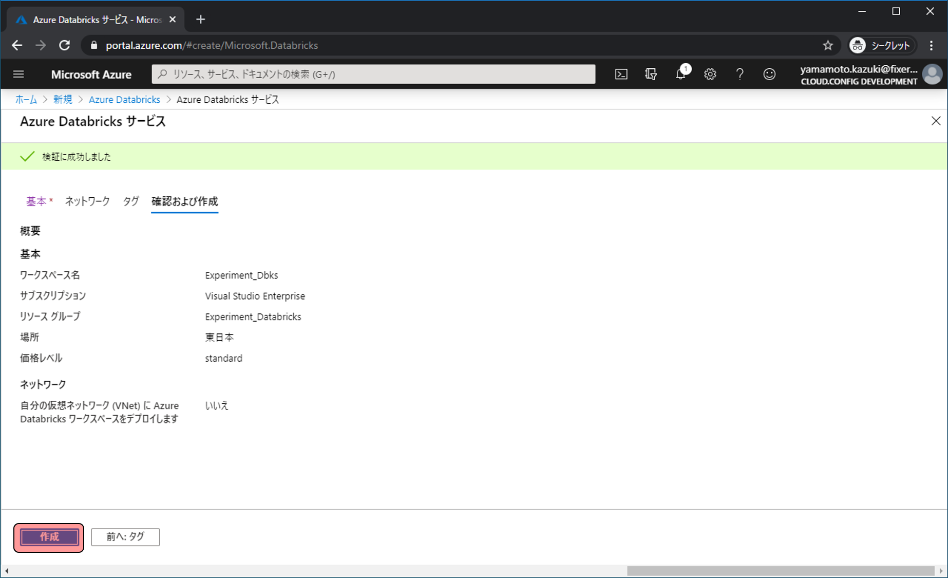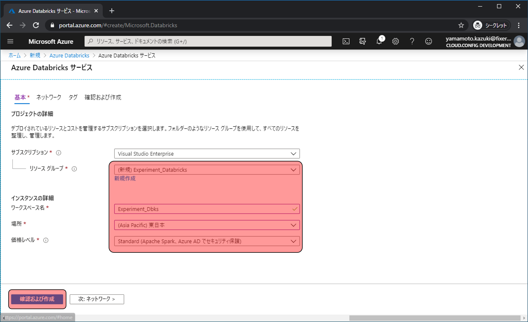 - リソースグループ: Azure Databricksを作成したリソースグループと同じもの