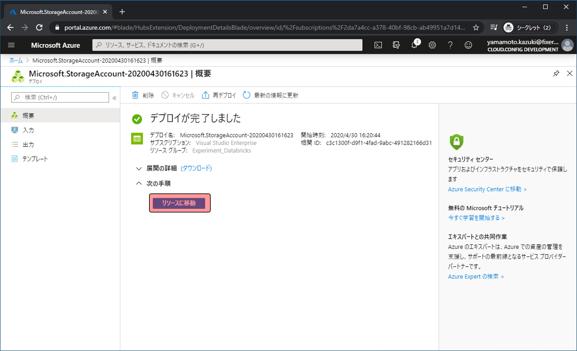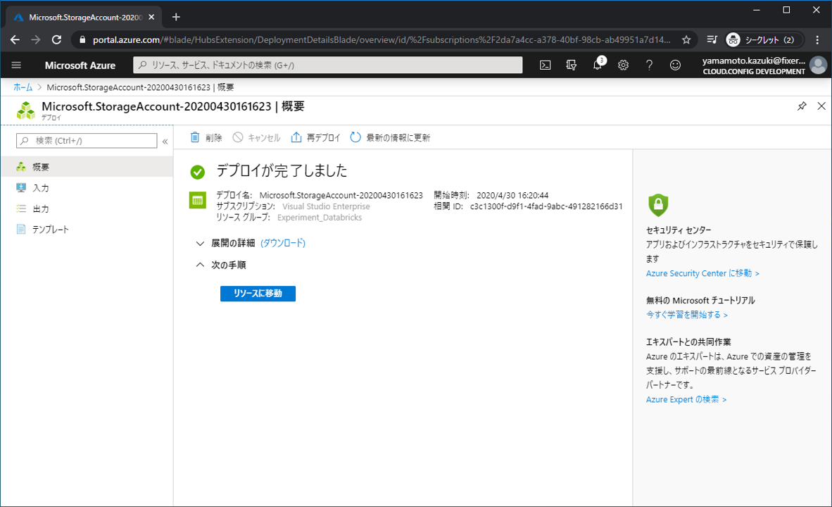 少しするとデプロイが完了します。これでStorage Accountの作成は完了です。
