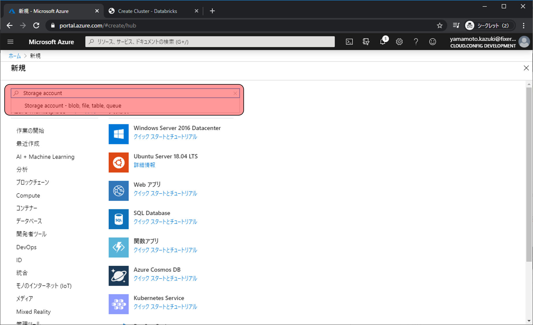 次にデータを格納しておくBlob Storageを準備します。Azure Databricksのときと同様にリソースの作成画面に移動し、検索欄にStorage accountと入力してStorage account - blob, file, table, queueをクリックします。