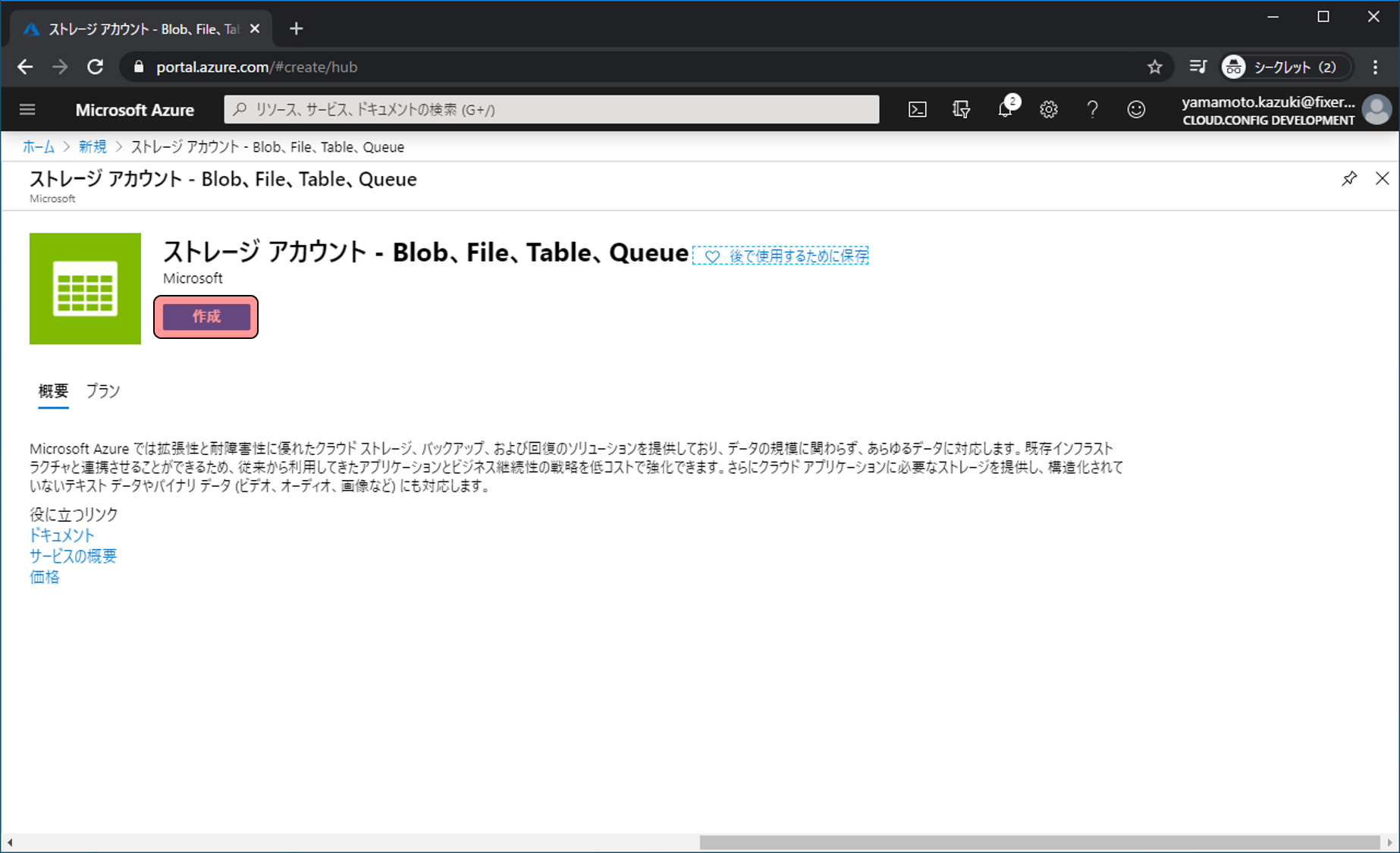 - アカウント種類: Blob Storage → 利用するサービスによって変更。TableやQueueを利用する場合はStandardV2を選択
