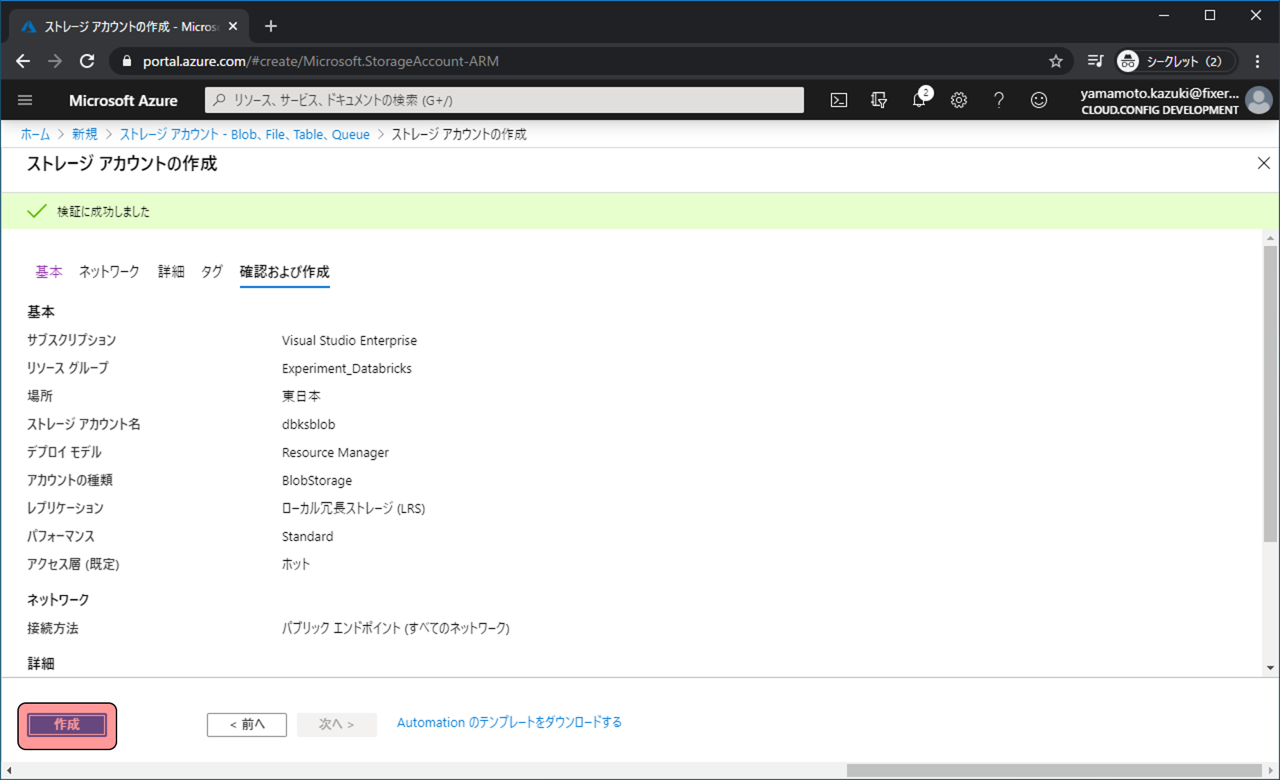 - ストレージアカウント名: 任意の文字列 → 作成するストレージに付ける名前