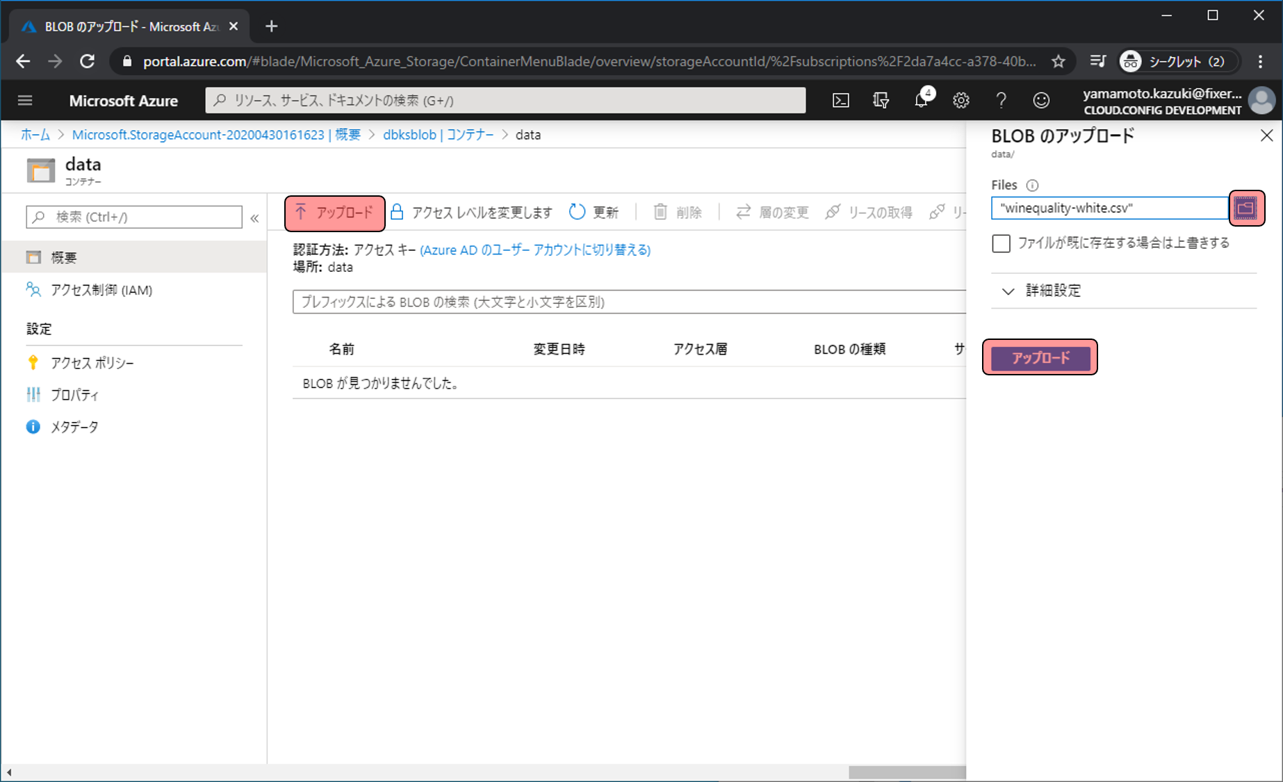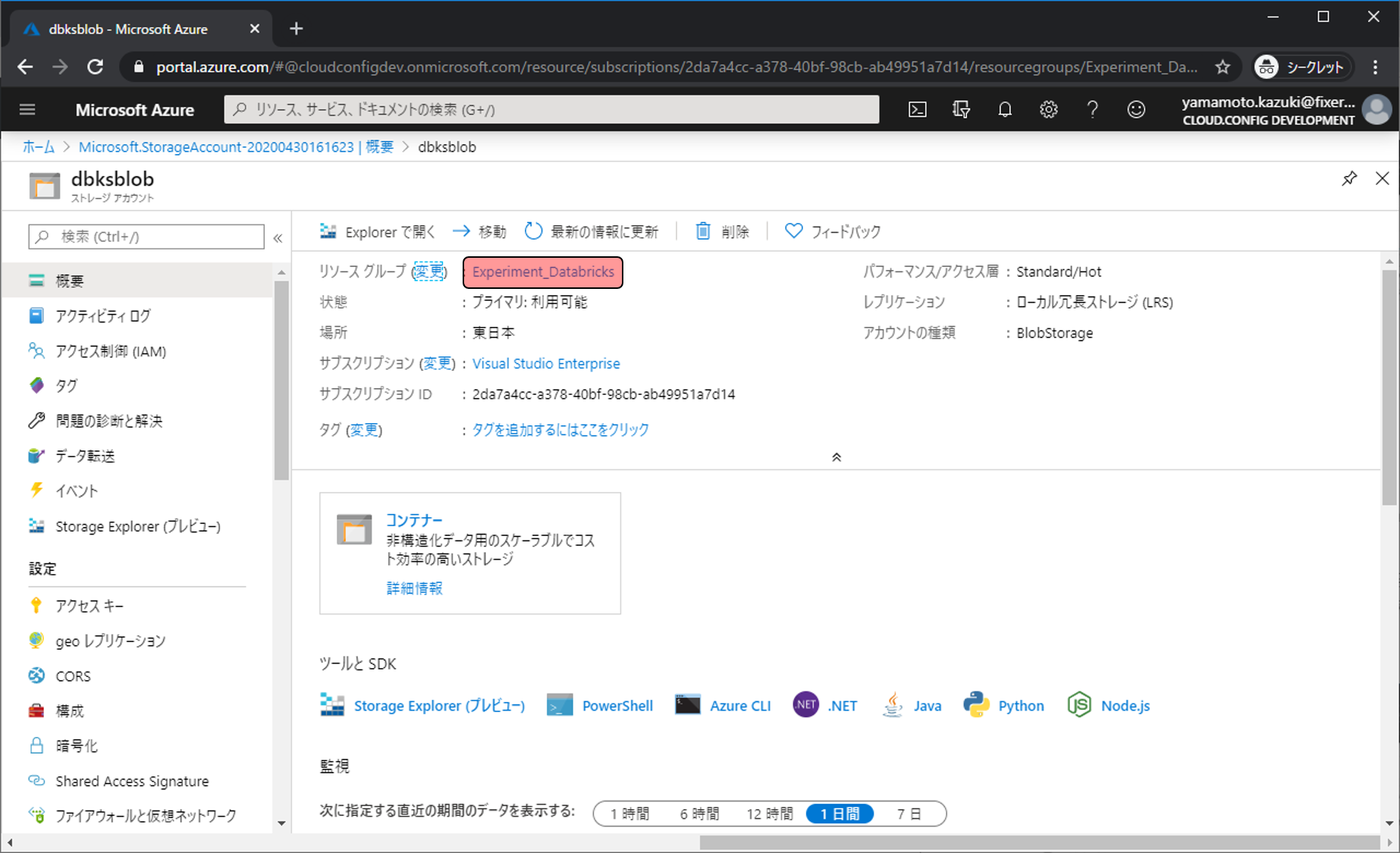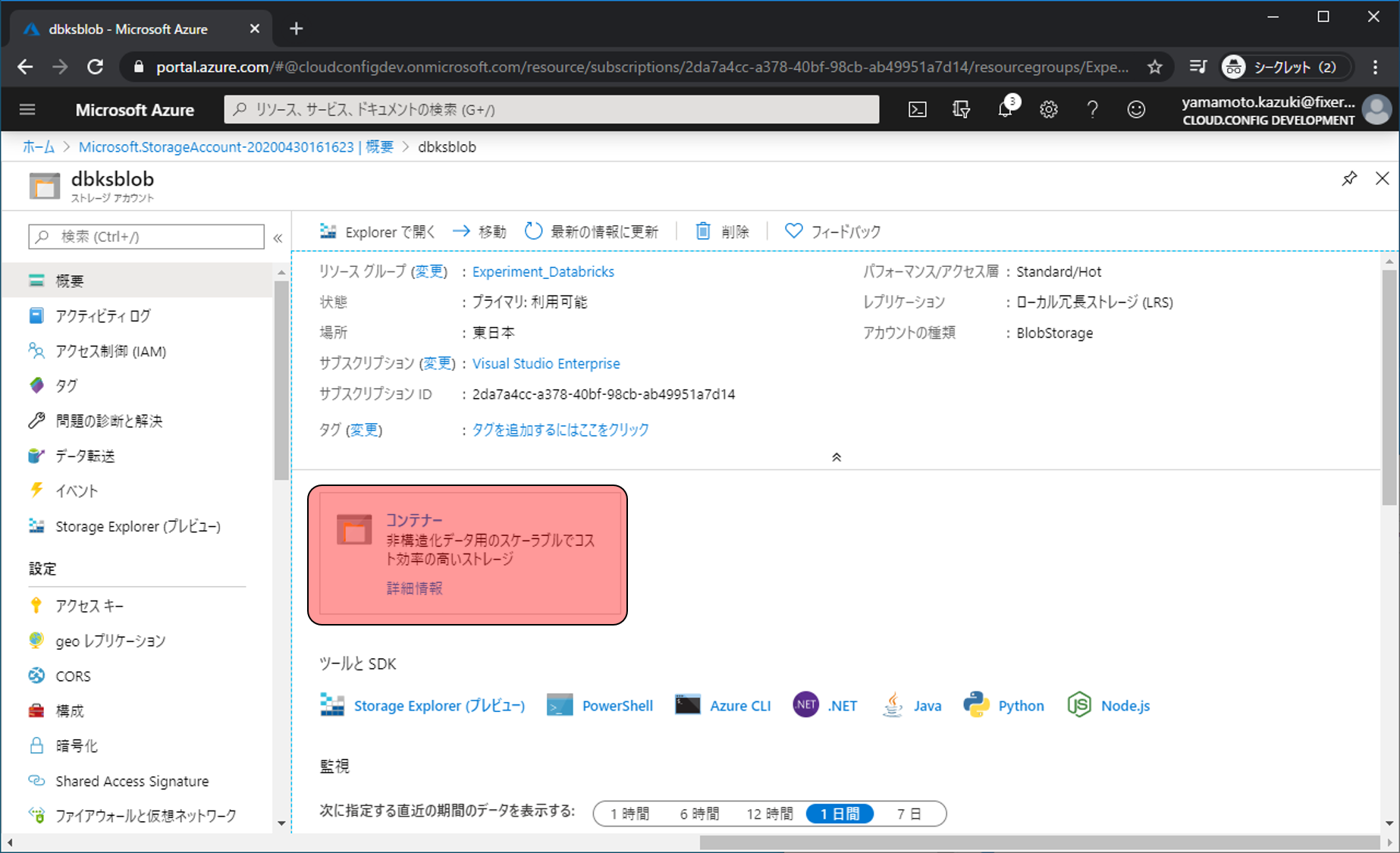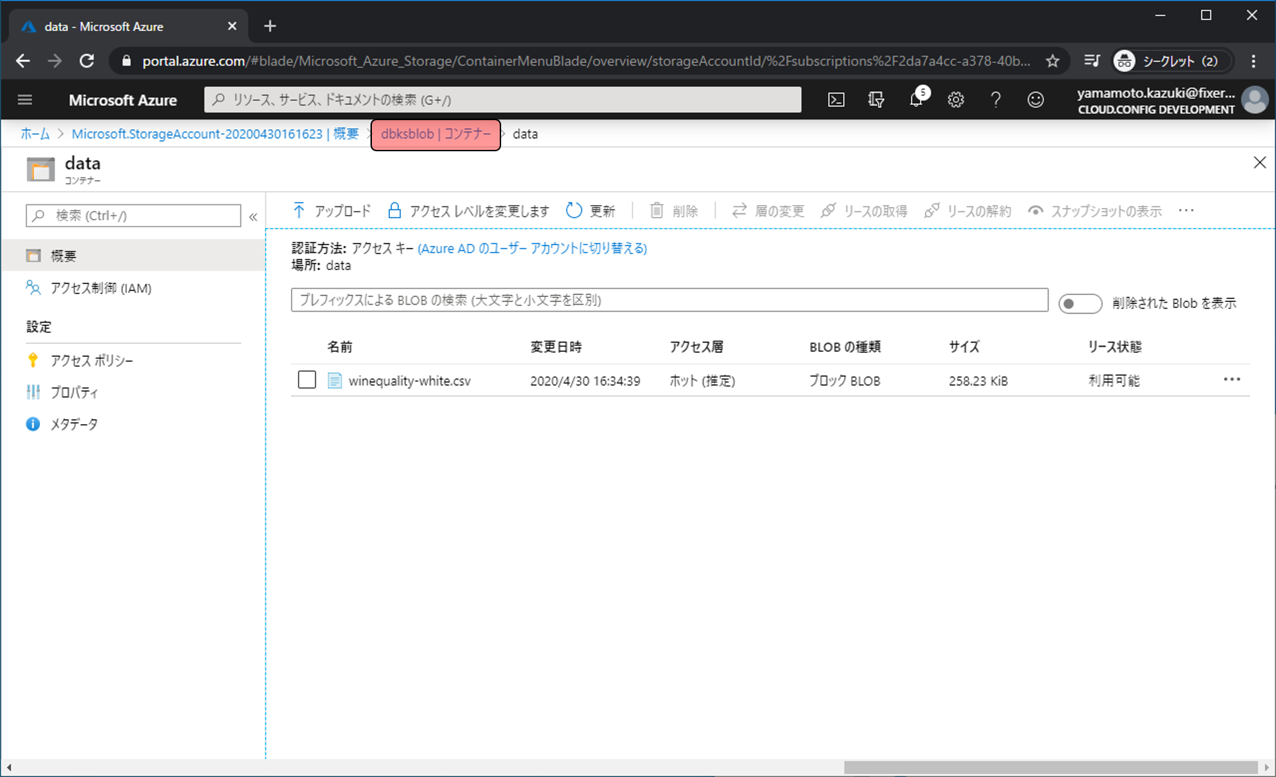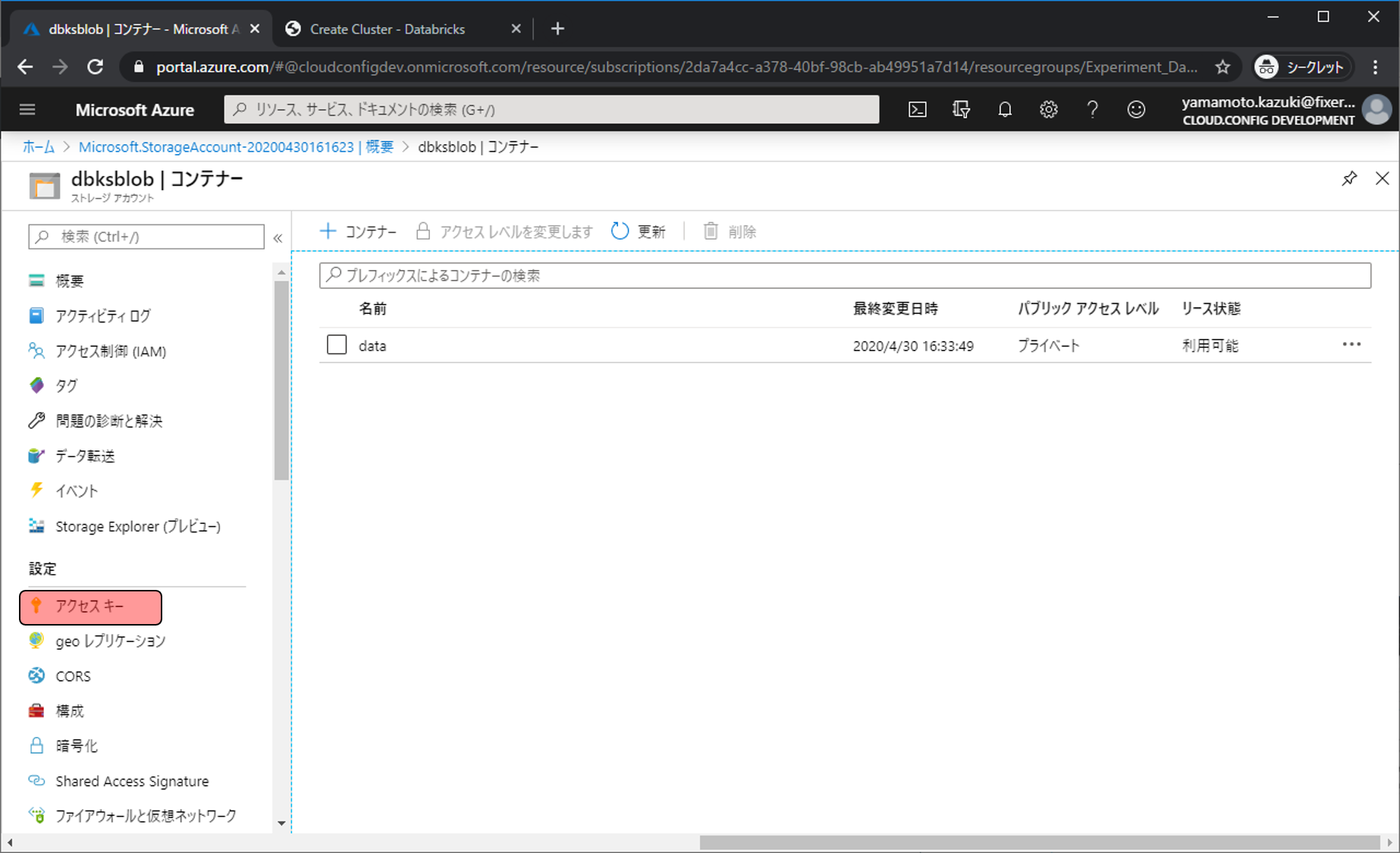 次はAzure Databricksからアップロードしたファイルなどにアクセスするためのキーを取得します。上の方にある(ストレージアカウント名) | コンテナー(今回はdbksblob | コンテナー)をクリックします。