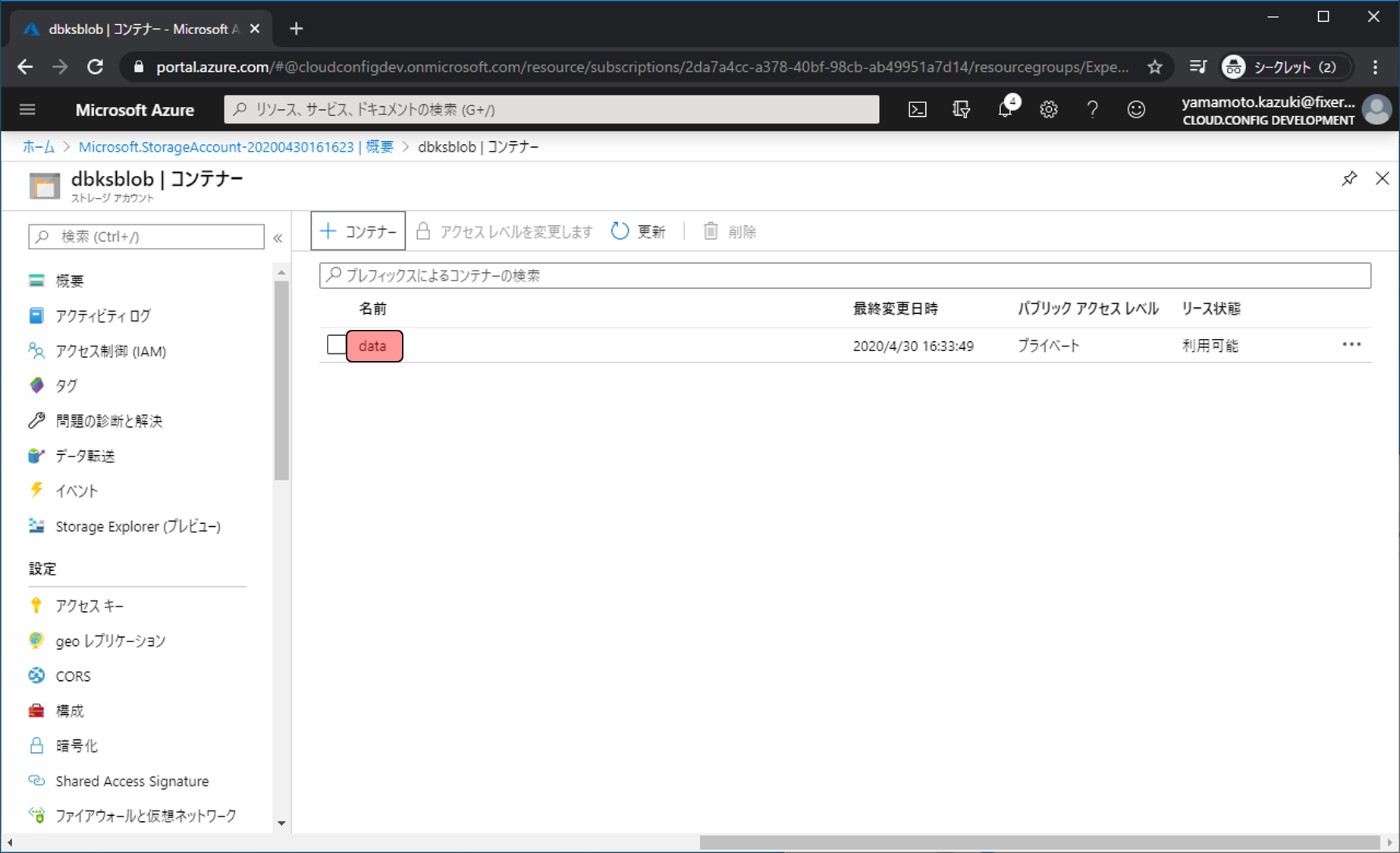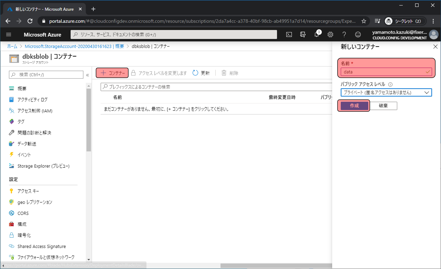 +コンテナーをクリックすると、右に入力欄が表示されるので、名前に任意の文字列(今回はdata)を入力し、作成をクリックします。