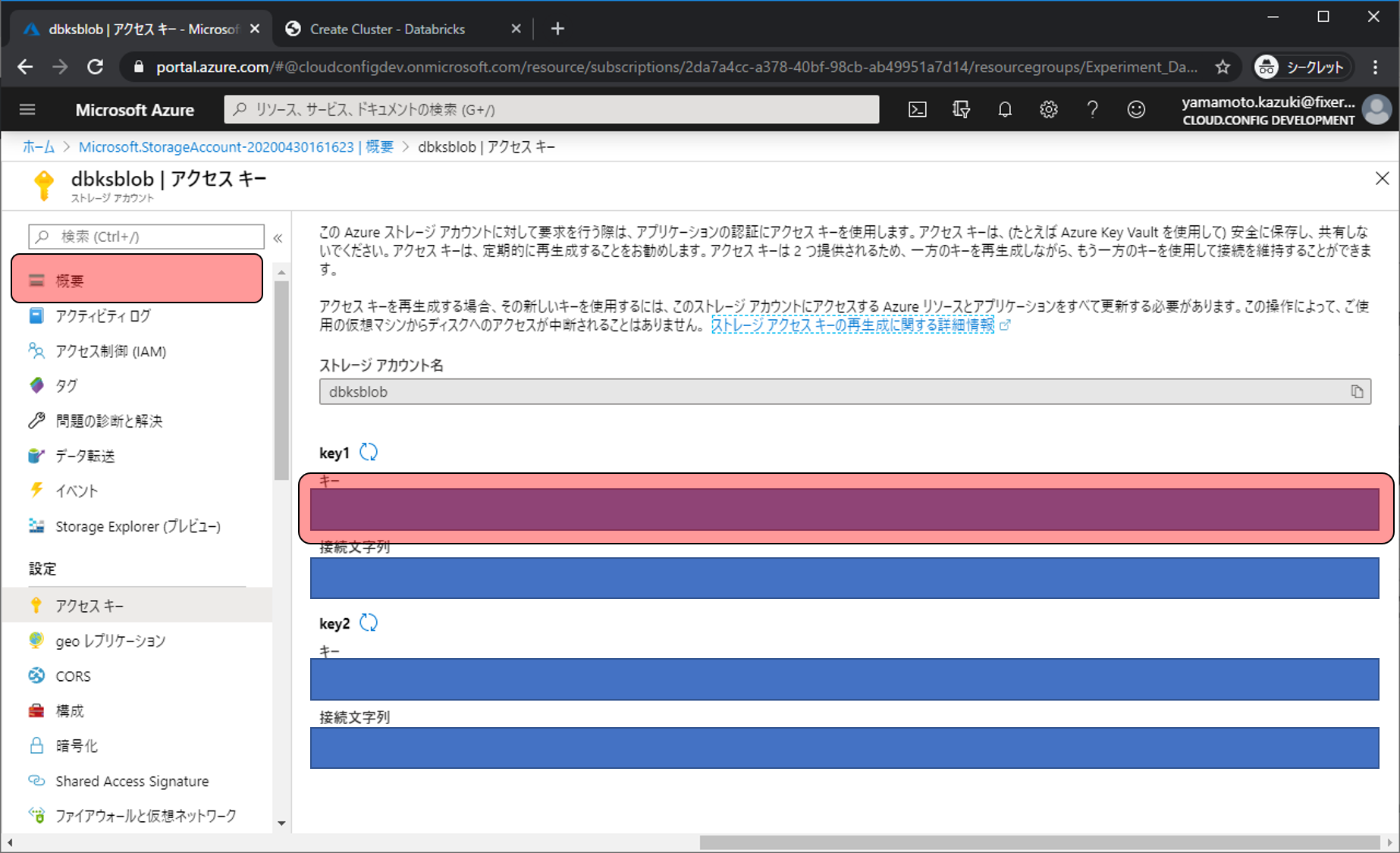 Key 1のキーをメモ帳等にコピーしておきます。これでStorage Accountで行う作業は終わりです。作成したAzure Databricksの管理画面に移動するため概要をクリックします。