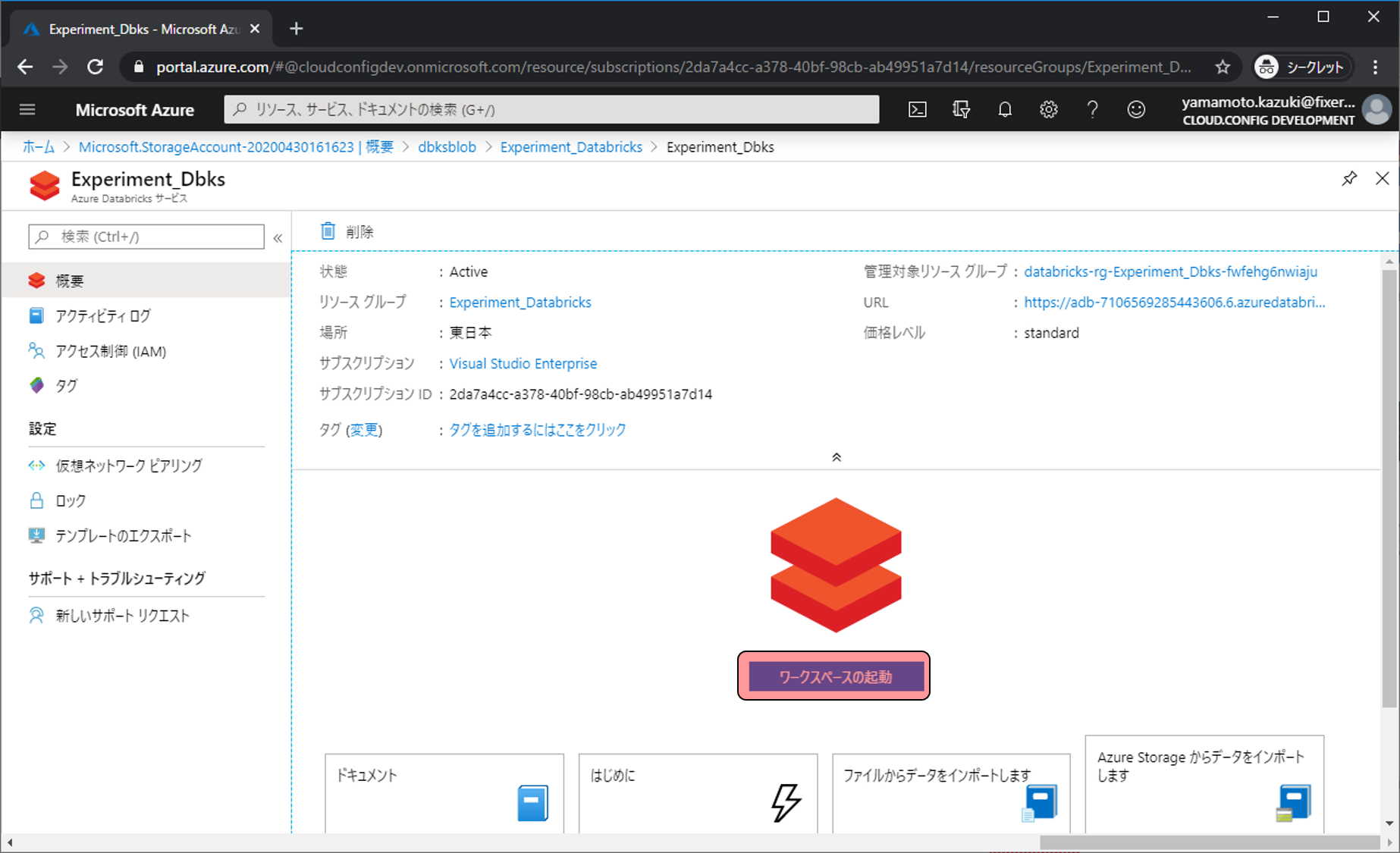 Databricksの具体的な利用はAzureポータルからはできません。専用のワークスペースに移動する必要があります。ワークスペースの起動をクリックします。