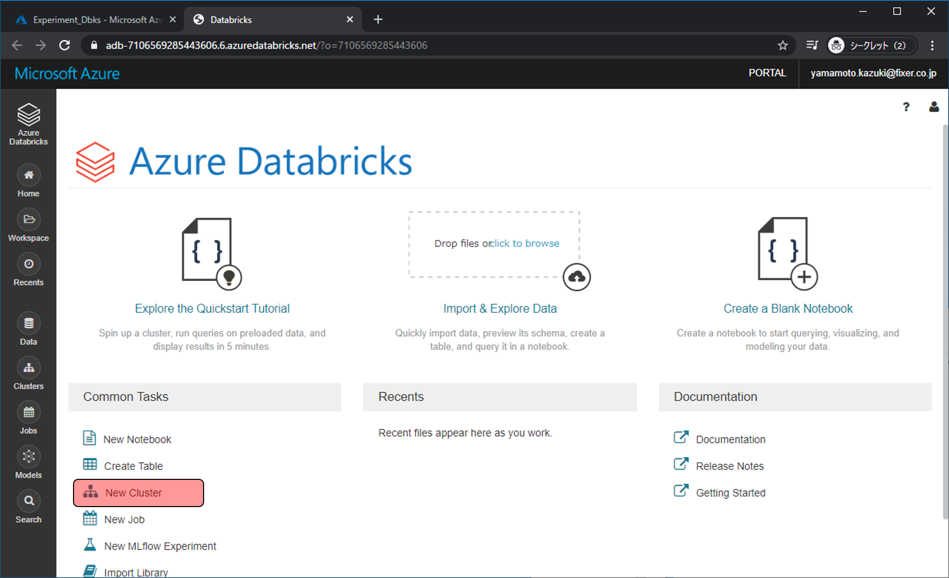 Azure Databricksのワークスペースに移動しました。ここでデータ分析などを行います。まずは、分析用のクラスター(VM)を作成します。New Clusterをクリックします。