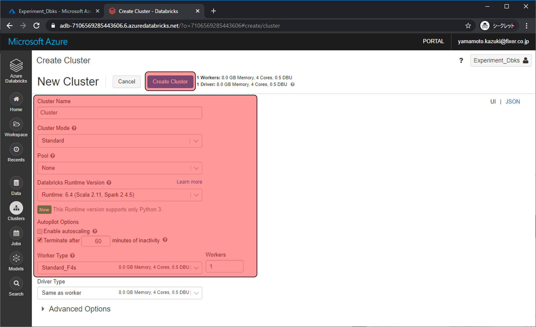 - Worker Type: Standard_F4s → VMのサイズになります。今回はCPU性能の高いFシリーズを利用