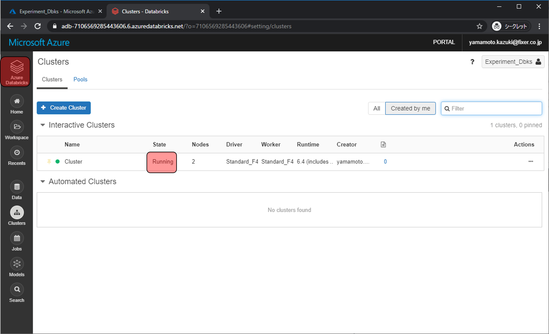 作成が開始され、5分程度待つとStateがRunningになります。Runningになったら左上のAzure Databricksをクリックしてメインページに戻ります。