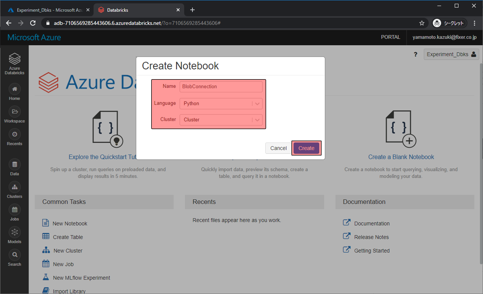Notebookの名前や、言語、どのClusterで利用するかを選び、Createをクリックします。