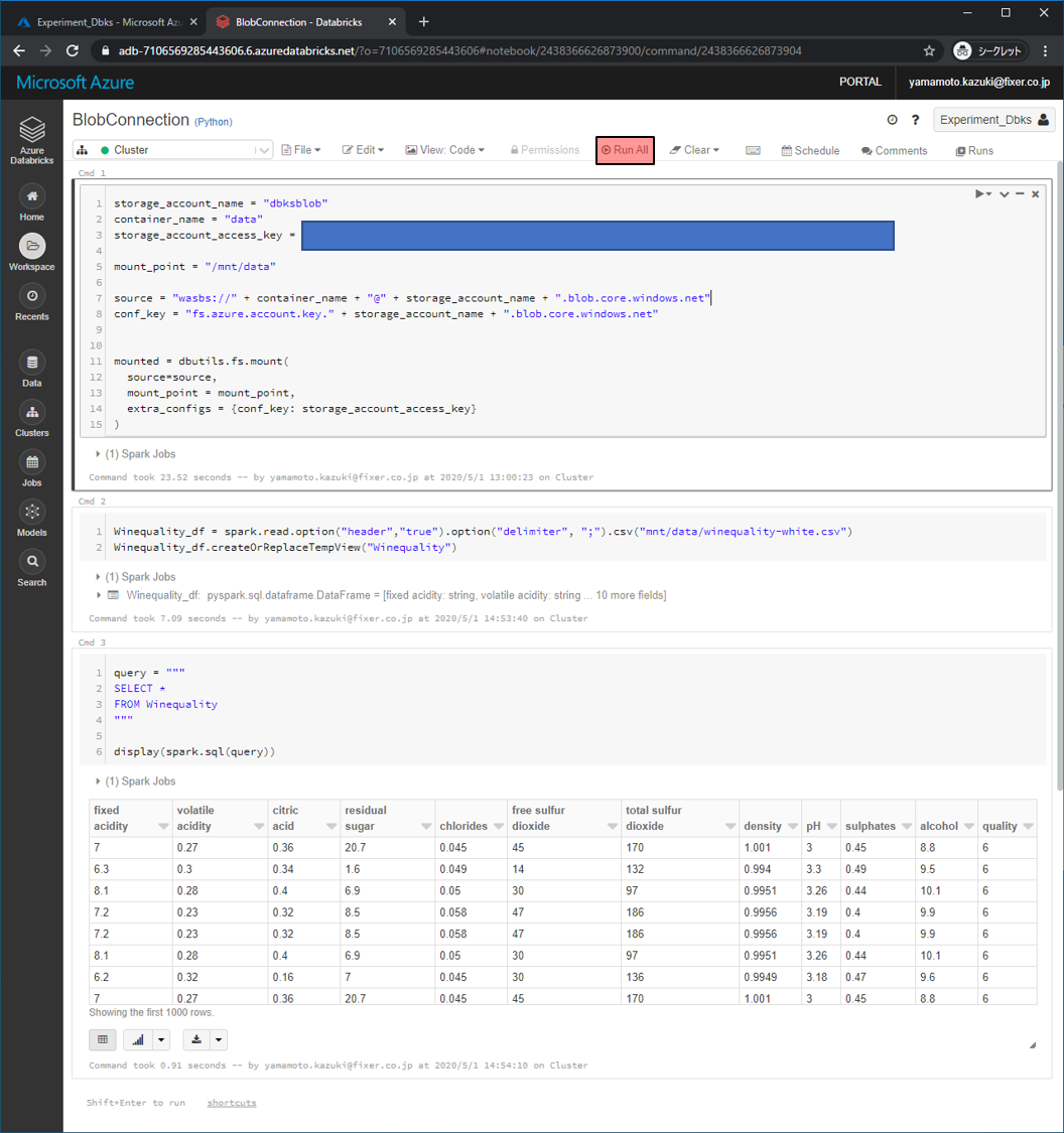まずは「BlobのコンテナーをAzure Databricksにマウント」をします。先程作成したストレージアカウント名やコンテナー名、アクセスキーを下記のコードの中に書き加えてください。今回の場合は下記のようになります。