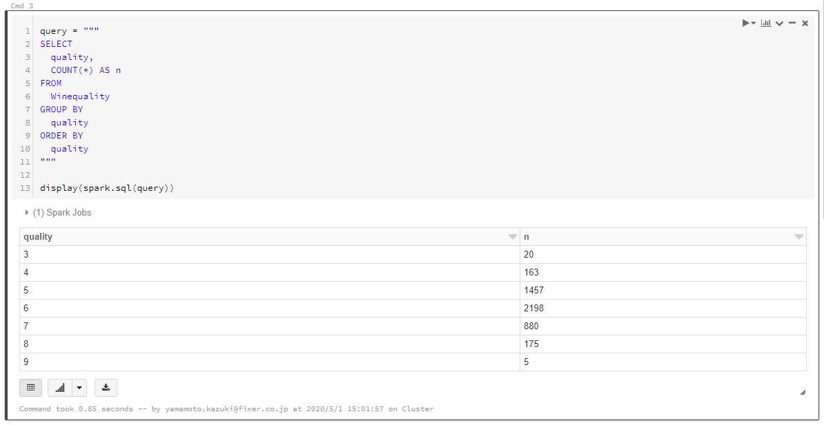 Winequality_df.createOrReplaceTempView("Winequality")これでBlob上のデータをクエリで扱うための準備が整いました。クエリを作成して、実行します。