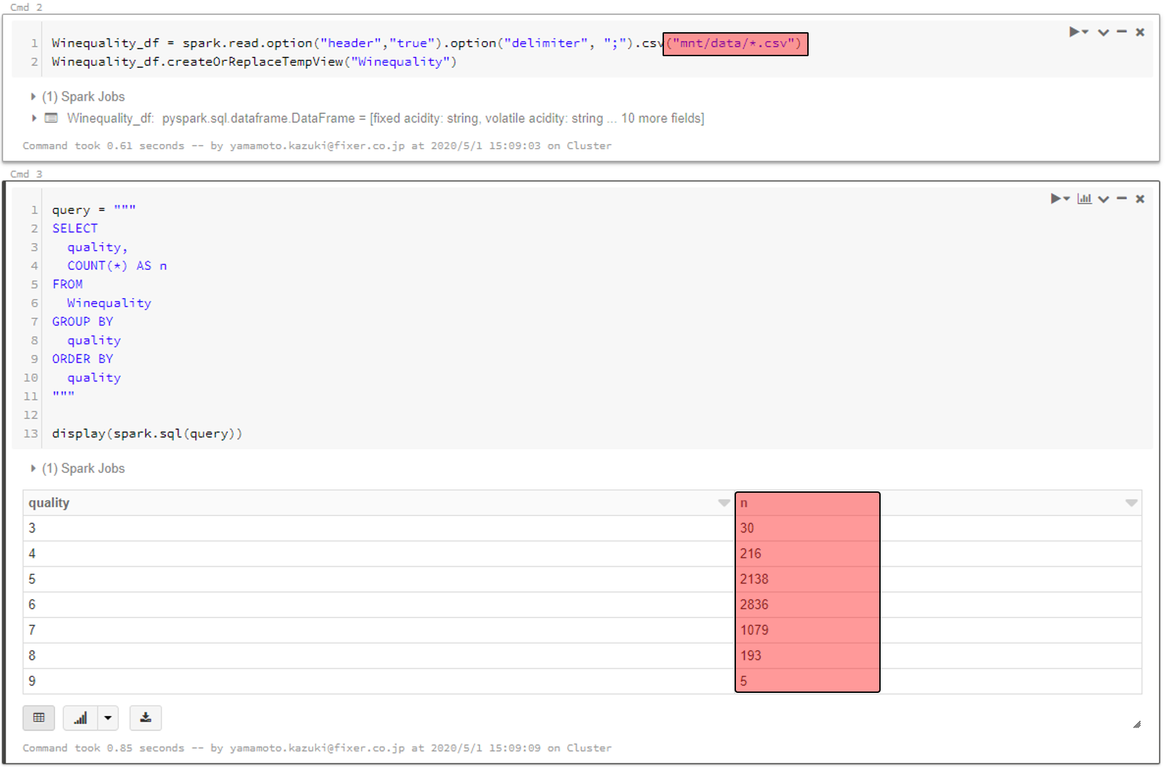 さらに、読み込むファイルの指定をワイルドカードにすると、複数ファイル同時に扱えます。(今回は赤ワインの情報を追加でBlobにアップロードし、マウントし直しました)