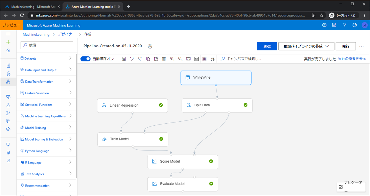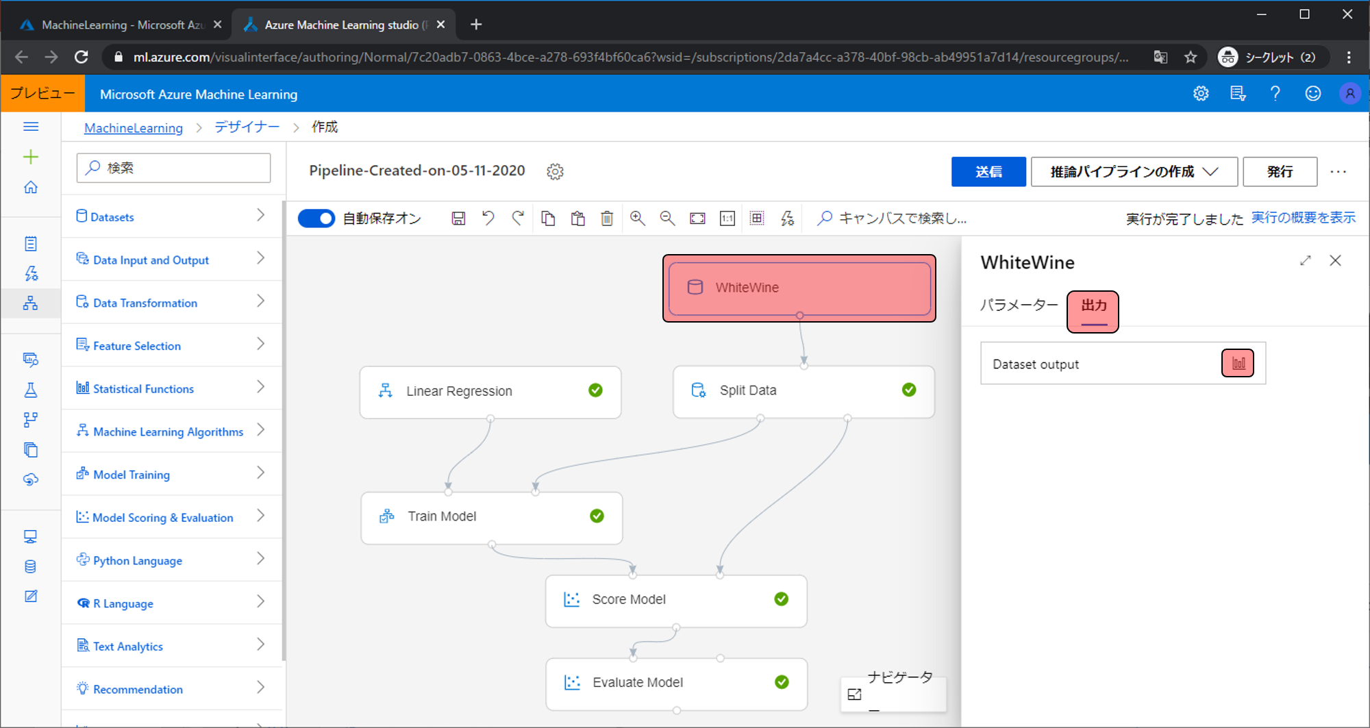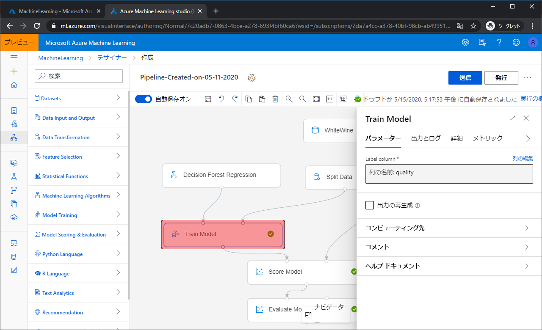 Train Modelでは、パラメータで予測対象を指定しています。この予測対象をquality(品質)からalcohol(アルコール度数)などに変更すると、予測モデルはqualityを含めた他の情報からアルコール度数を予測するようになります。