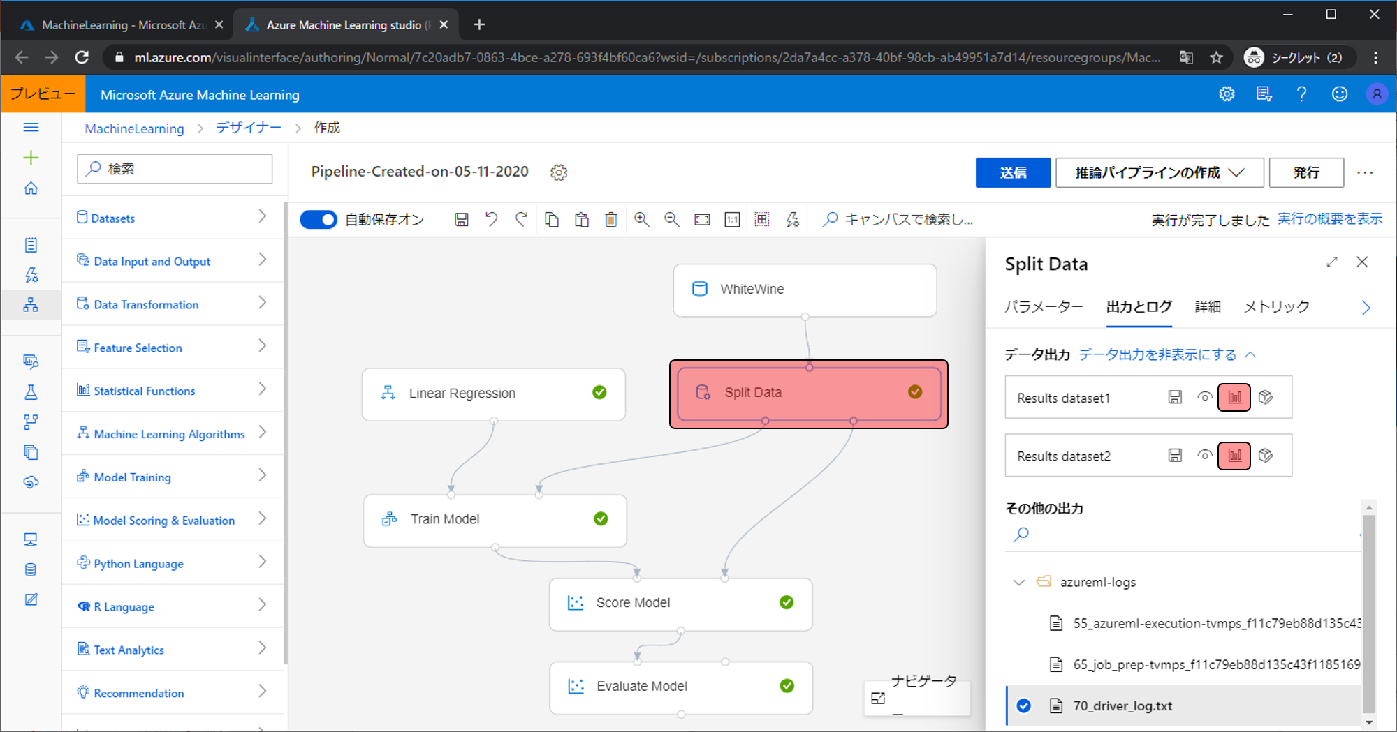 Split Dataの出力も同様に確認することができます。右側の出力がResults dataset1、左側の出力がResults dataset2です。