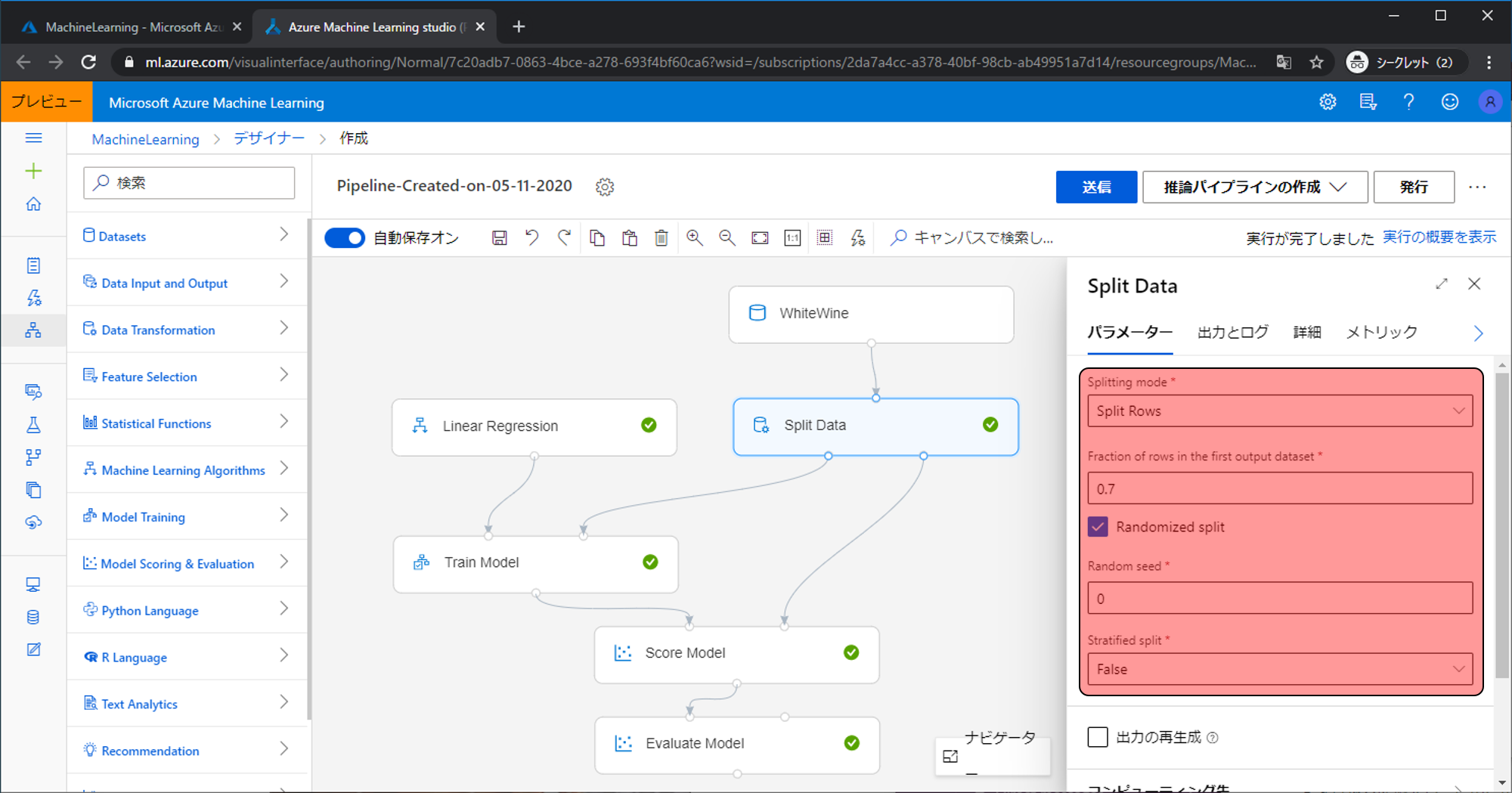 - Fraction of rows in the first output dataset:右と左の出力でデータが出る割合を調整できます。0.5だと100件のデータが入力されていた場合は右から50件、左から50件出力されます。0.7にした場合は、右から70件、左から30件出力されます。
