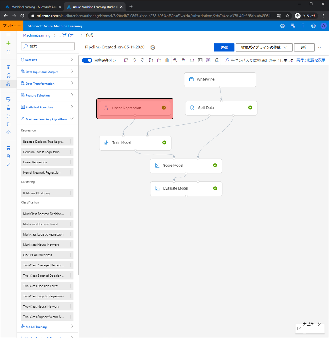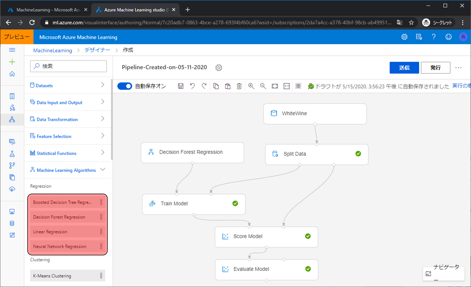 Linear Regressionモジュールを別のRegressionモジュールと置き換えるだけで、違ったアルゴリズムを使ったモデル作成ができます。