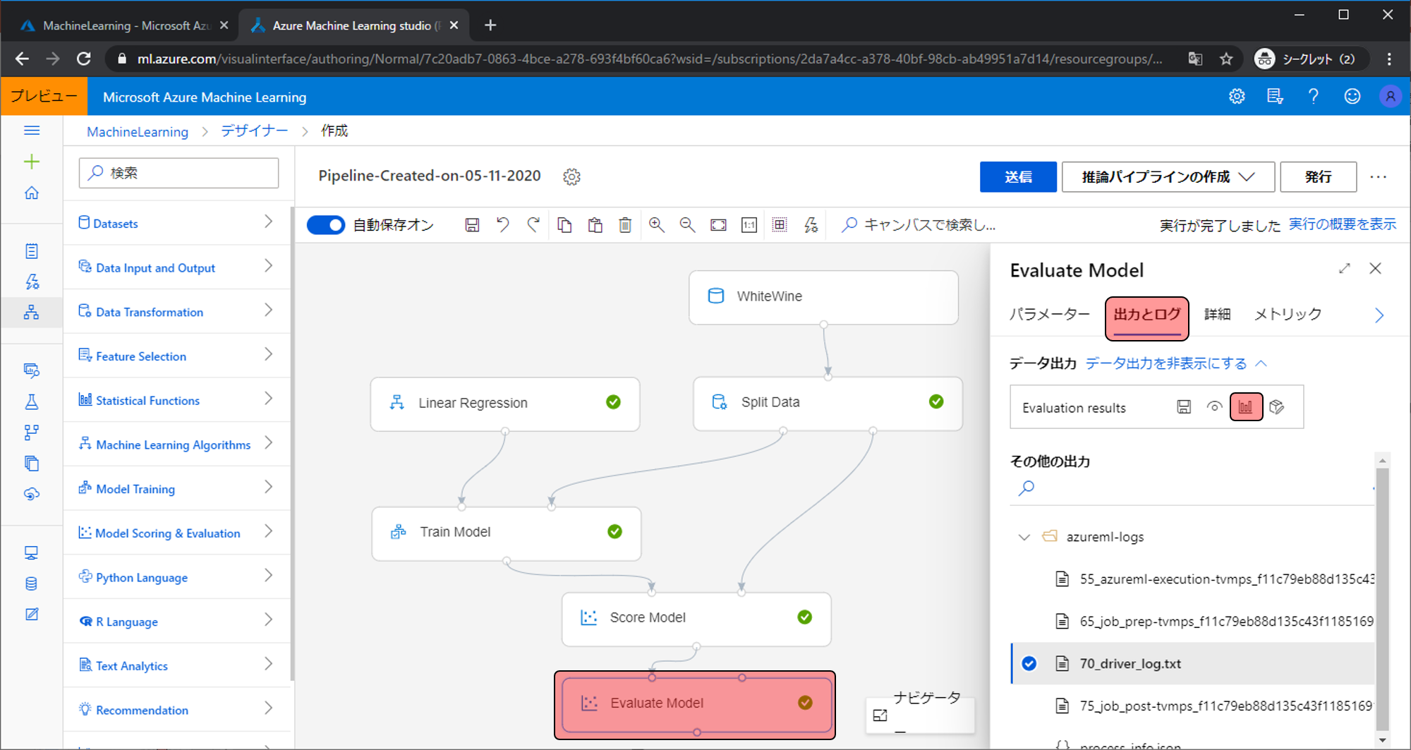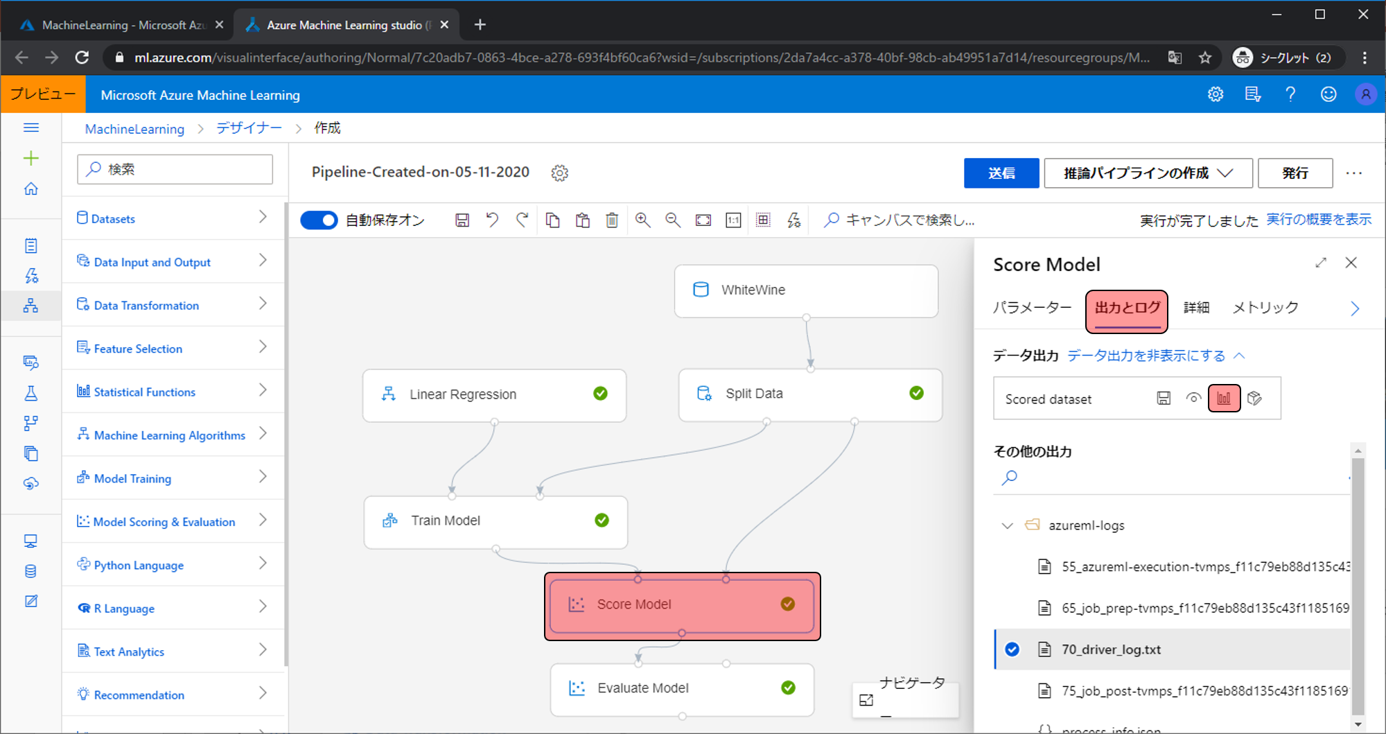 Score Modelで実際にどんな予測をしているのか見てみましょう。Score Modelをクリックし、出力とログの可視化ボタンをクリックします。