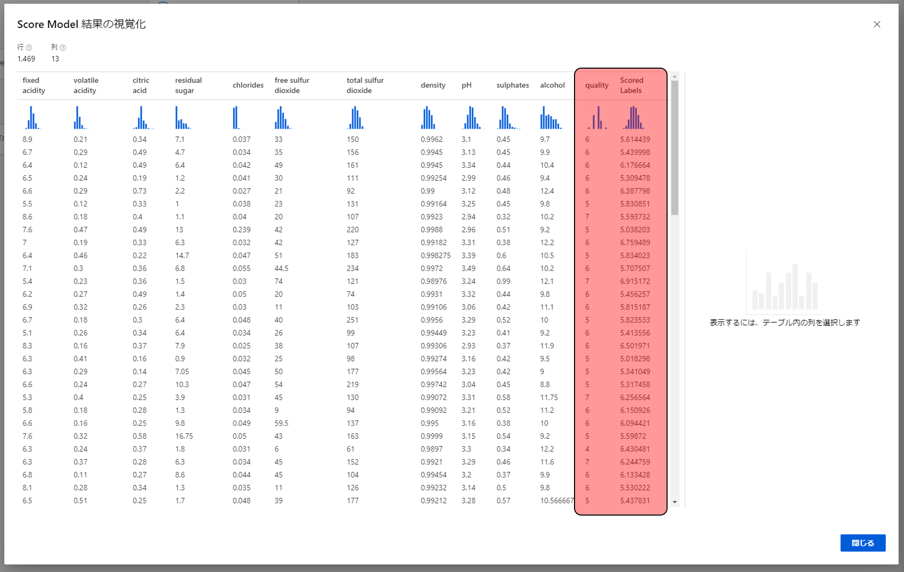 Scored Labelsに予測した値が表示されます。qualityの値と比較するとどのくらい合っているのかがわかります。