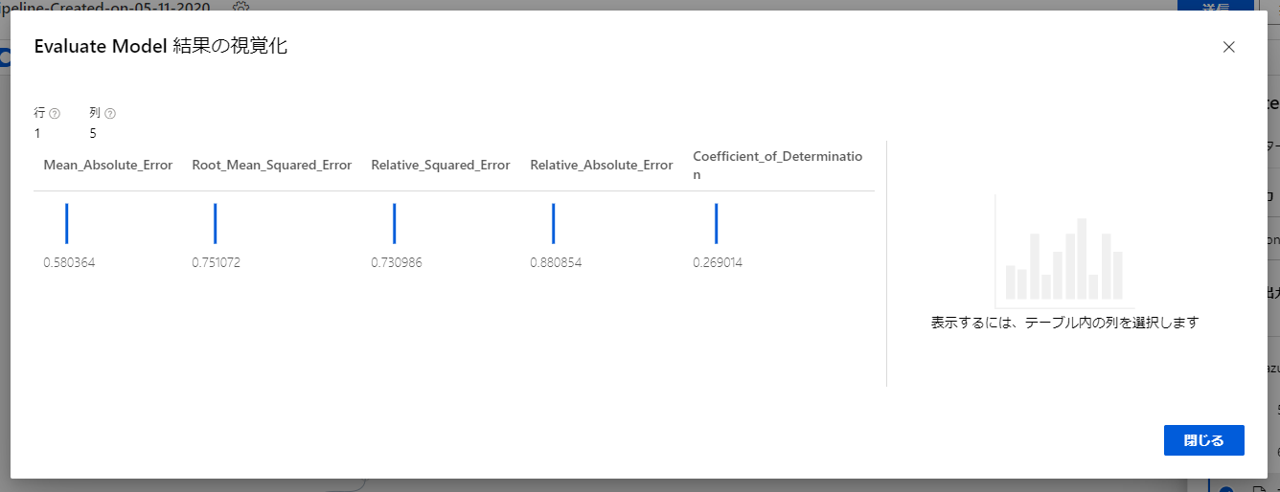 各項目がモデルの評価を表しています。モデルの評価項目は利用するアルゴリズムによってことなります。今回はLinear Regressionを利用したときの評価項目です。