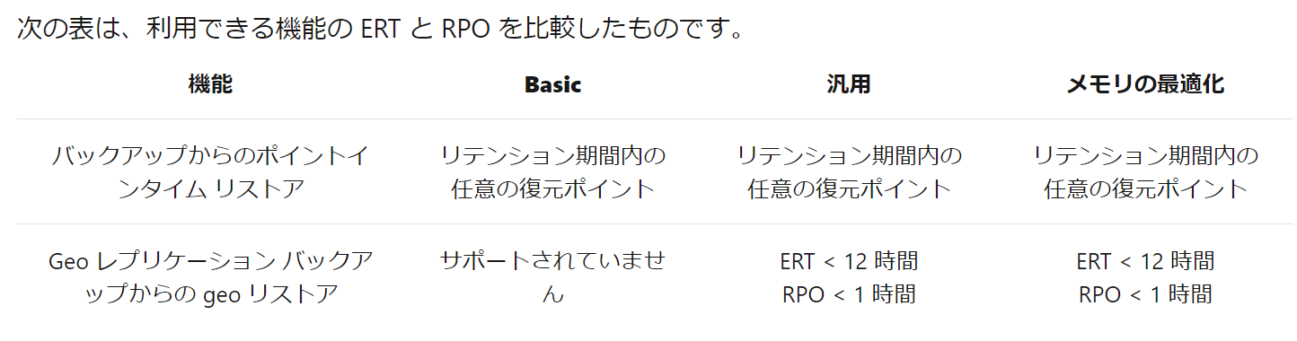 あと参考情報として、DB復元方式別の推定復旧時間(ERT)と目標復旧時点(RPO)を載せておきますね。業務で活用される際は、実現したいERT/RPO要件とにらめっこしながらAzure Database for MySQLの価格レベルを検討くださいませ。