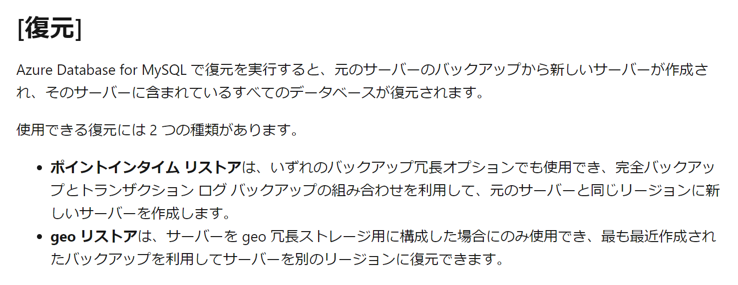 では、いよいよお楽しみのDB復元の時間です。Azure Database for MySQLでは、2つのDB復元方式の用意があります。