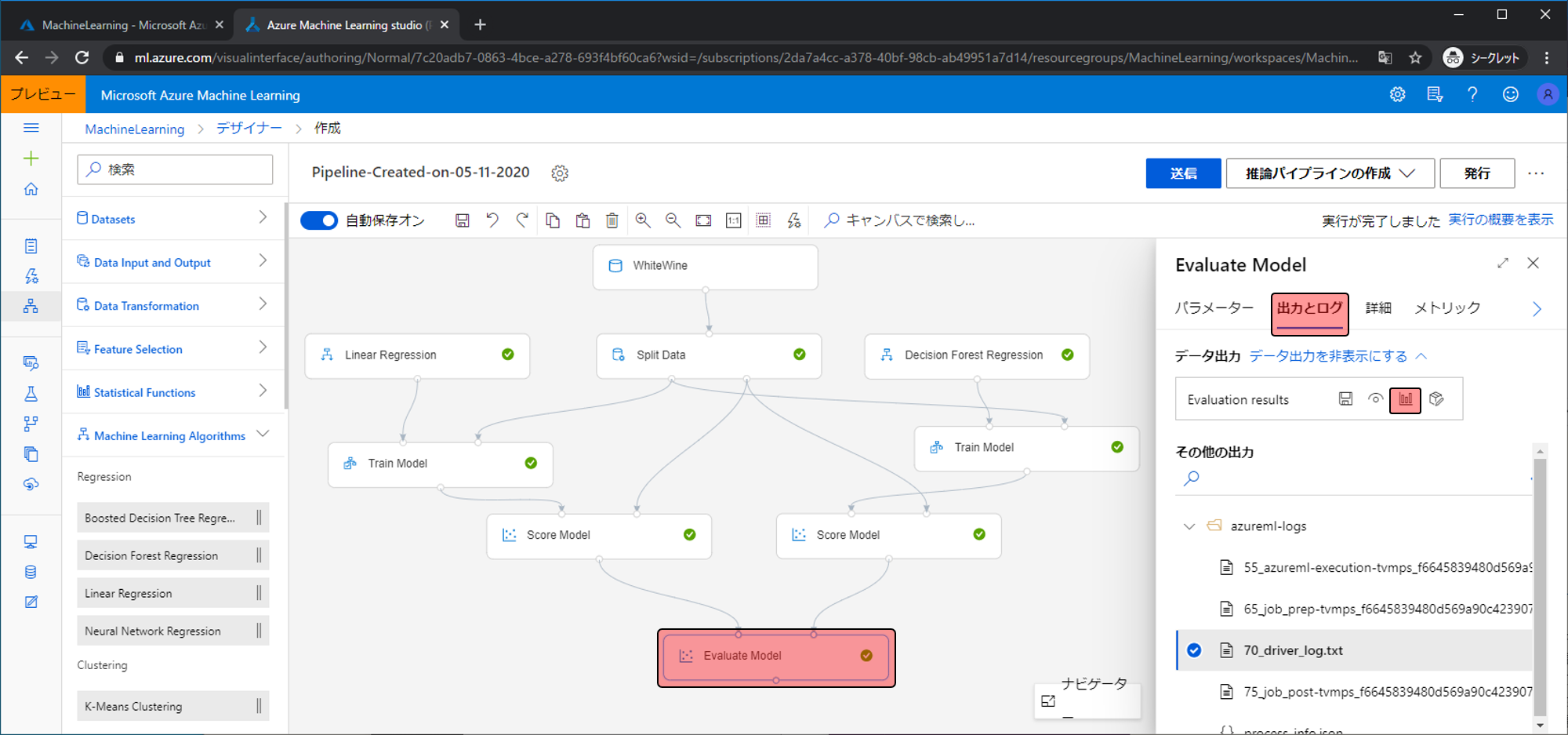 Evaluation Modelの結果を確認します。出力とログの視覚化をクリックします。