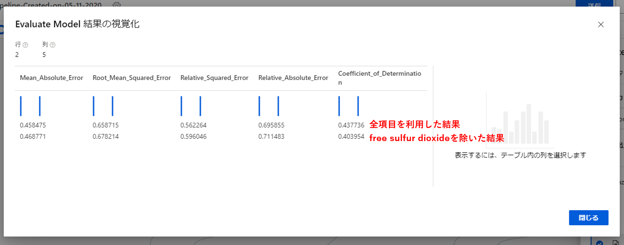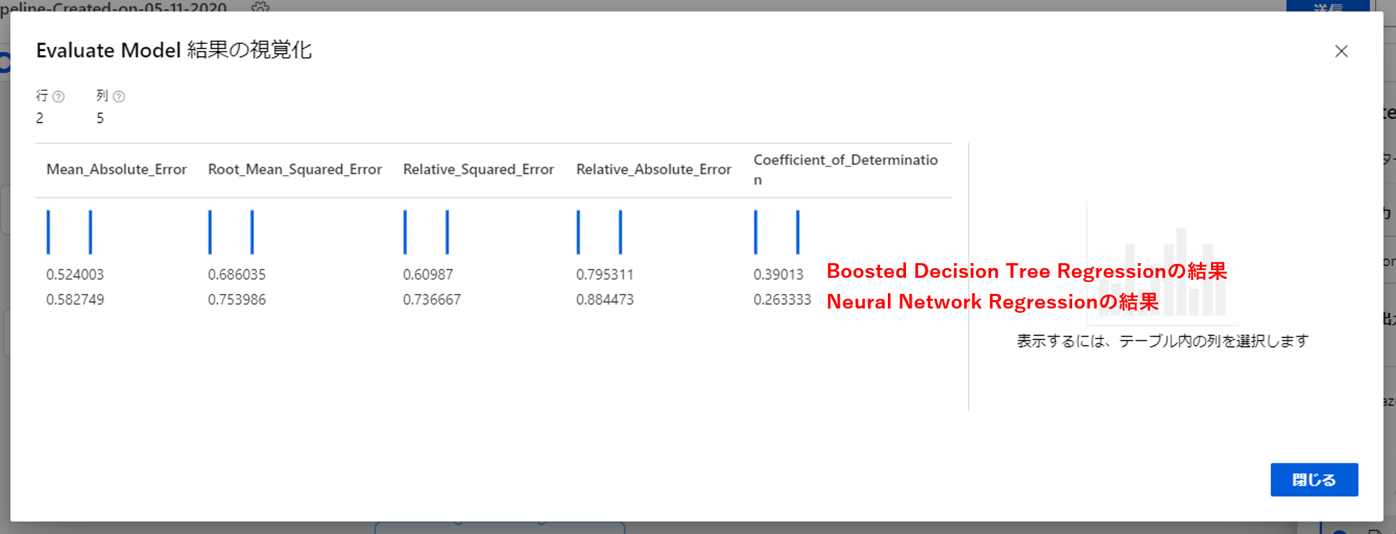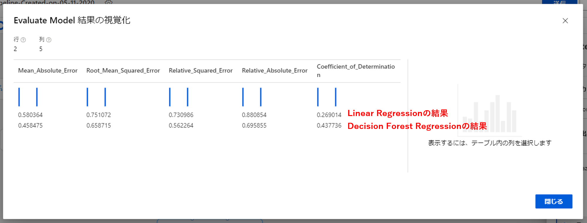 上がLinear Regressionの結果、下がDecision Forest Regressionの結果になります。今回は比較するためCoefficient_of_Determinationに着目します。