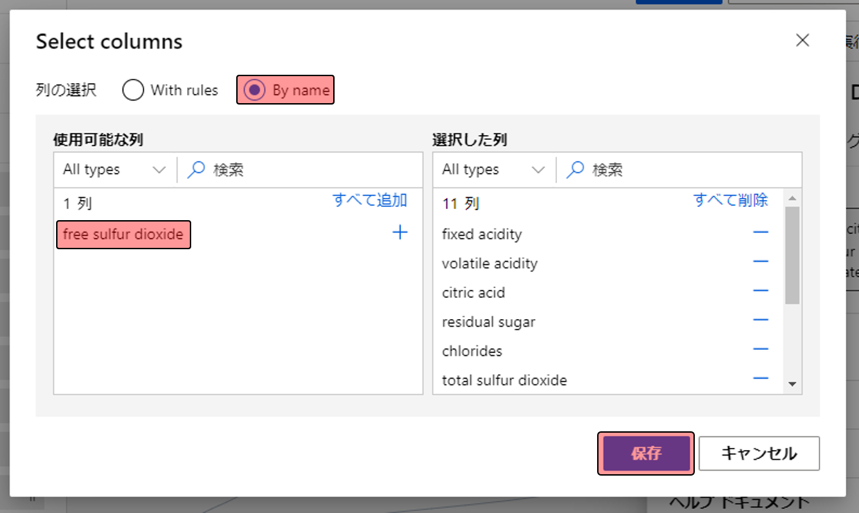 By nameを選択し、使わない項目(free sulfur dioxide)だけ残して、それ以外は[+]をクリックして右に移し、保存をクリックします。