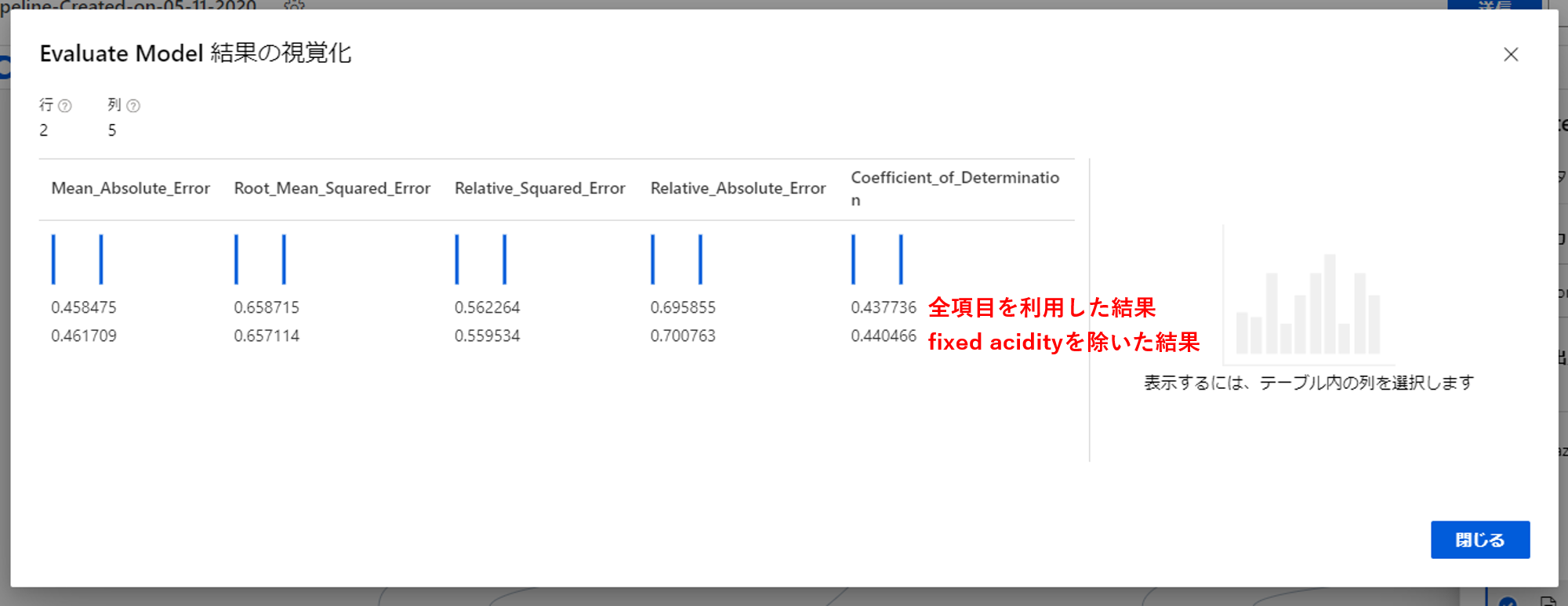 すると、Linear Regressionのときは0.269なのに対してDecision Forest Regressionは0.437と高くなりました。値が1に近いほうが優れているため、Decision Forest Regressionで作ったモデルのほうが優れていることがわかります。