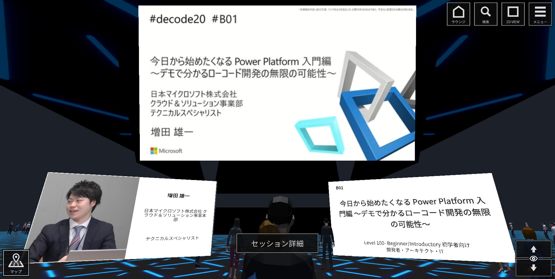 バーチャル空間(ラウンジ)で気分をぶち上げてから、セッションに見ると楽しさ倍増です。セッション内のデモンストレーションは、2D Viewに切り替えると見やすい。楽しみたいポイントごとに3D / 2Dを切り換えるといった感じです。手元で自分のペースで見たい方は、セション資料をダウンロードしておくとよいです。