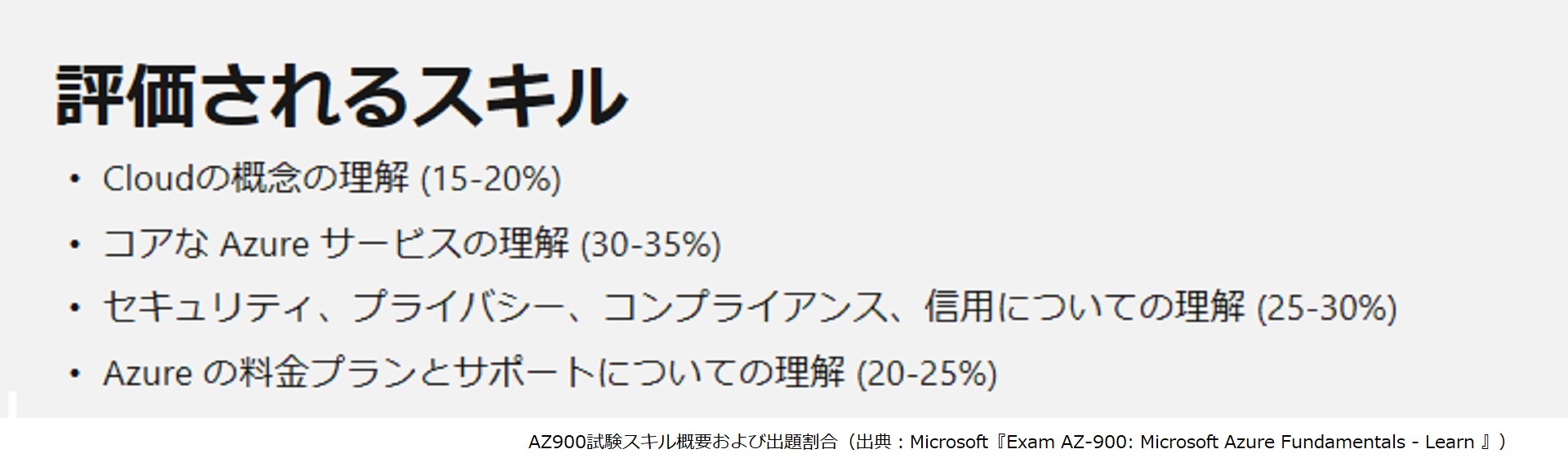 とはいっても、出題範囲は幅広く、クラウドの基礎やAzureの特徴、セキュリティなど全4テーマの中から44問出題されるので、クラウドを学ぶ1歩としてはとてもよい資格ですよね!