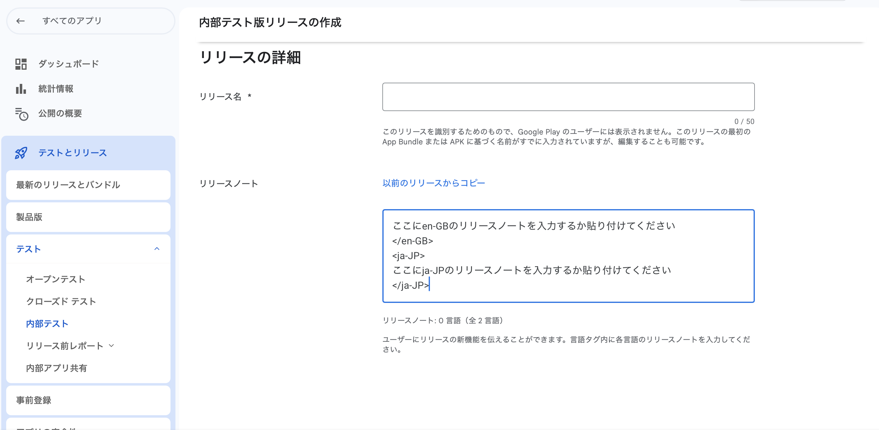app-release.aabをドラッグ&ドロップ- リリースノートを入力(初回は「初回リリース」など)
