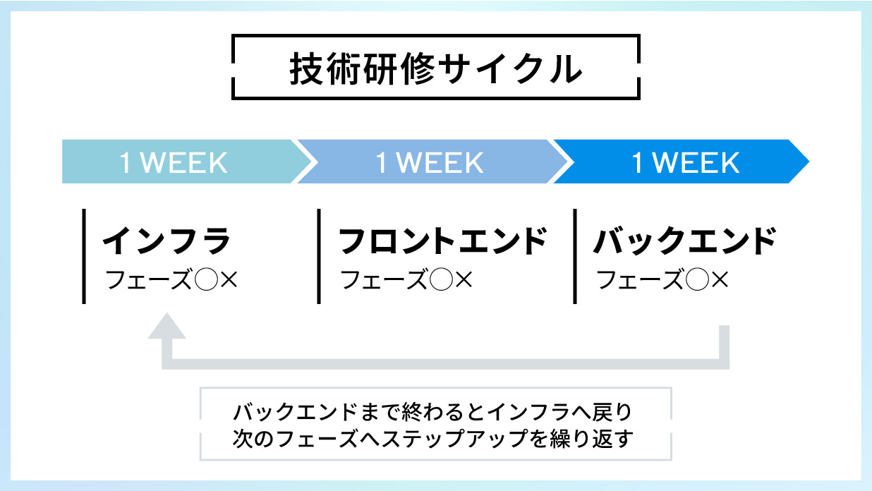 ●2週目からは、インフラのフェーズ1を1週間→フロントエンドのフェーズ1を1週間→バックエンドのフェーズ1を1週間という計3週間を1回りとしてサイクルを組み、フェーズ1の3週間が終わると次はフェーズ2の研修サイクルを回す