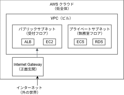 「VPC(Virtual Private Cloud)とは、AWS上に作成する仮想的なプライベートネットワークのことです。VPCについては、ビルに例えると分かりやすいです。VPCをフロア全体とすると、パブリックサブネットは受付フロア、プライベートサブネットは執務室です。それでいうと、Internet Gatewayは正面玄関口と言えるでしょう。」