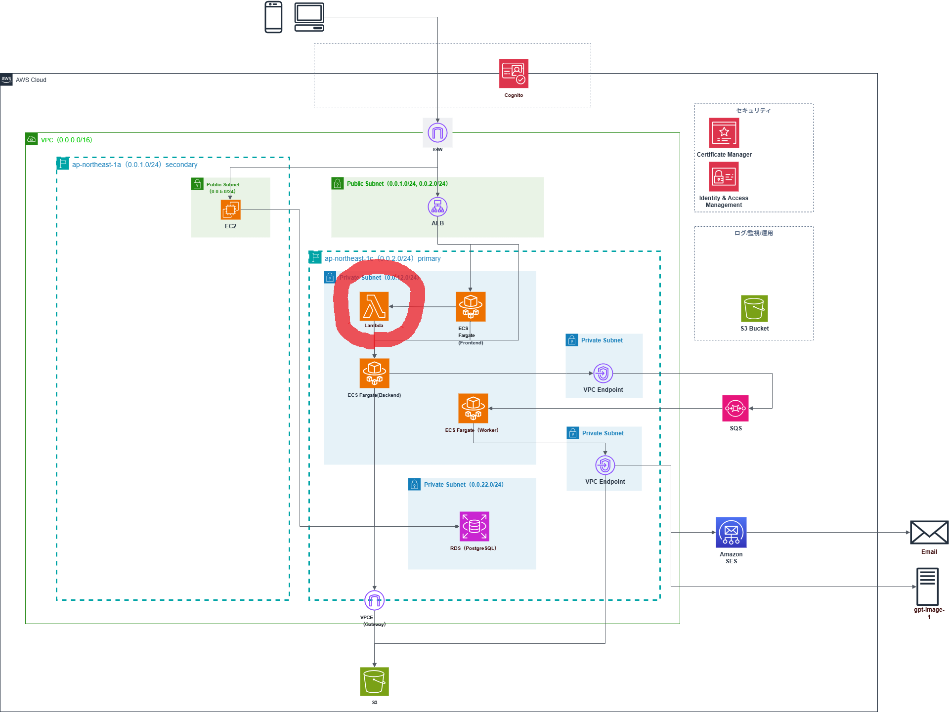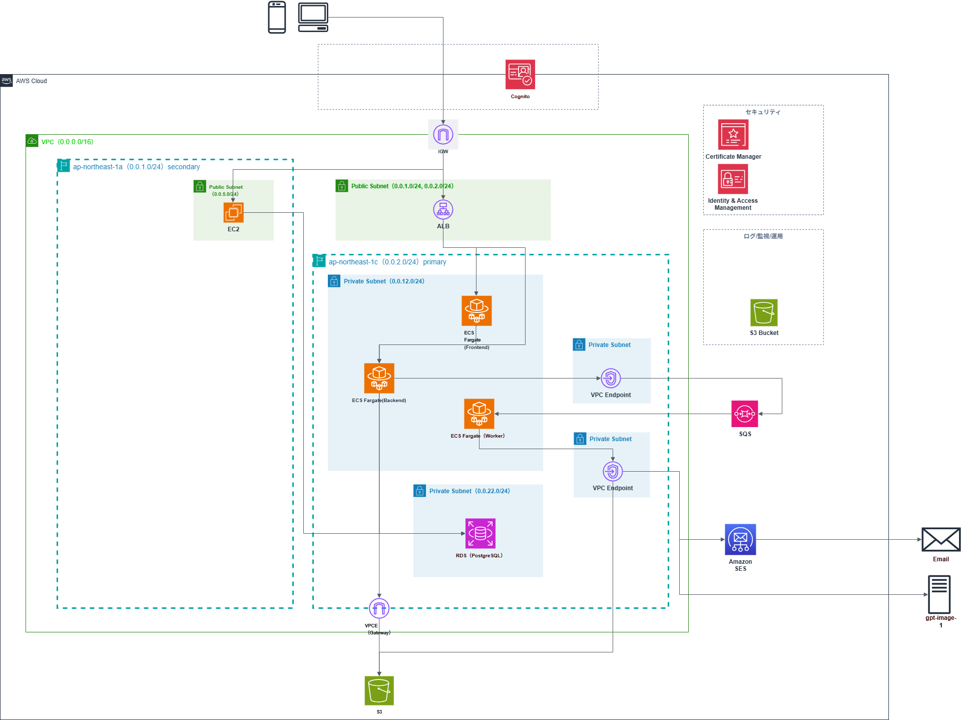 バックエンドAPIをコンテナ化し、ECR(Elastic Container Registry)にイメージをプッシュ。ECSタスク定義でそのイメージを指定し、ECSサービスとして常時稼働させています。また、画像生成処理用のワーカーも別のECSサービスとして動かしています。こちらはSQSからメッセージを受け取って処理するバッチ的な役割ですね。